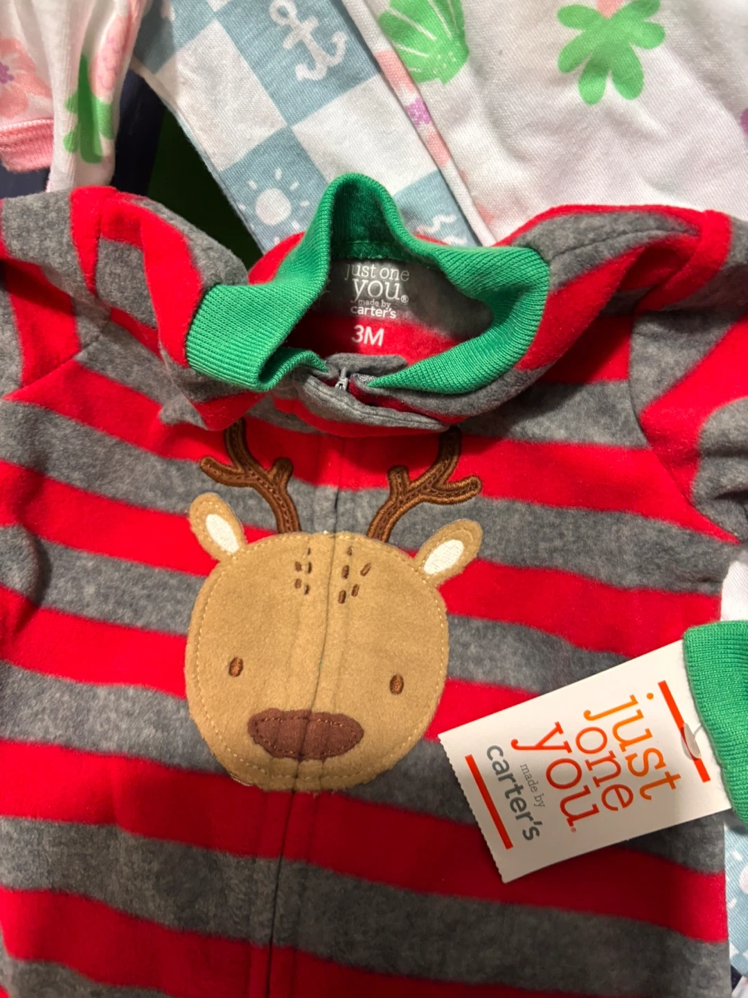 - A Just One You by Carter's red and gray striped reindeer sleeper, size 3M