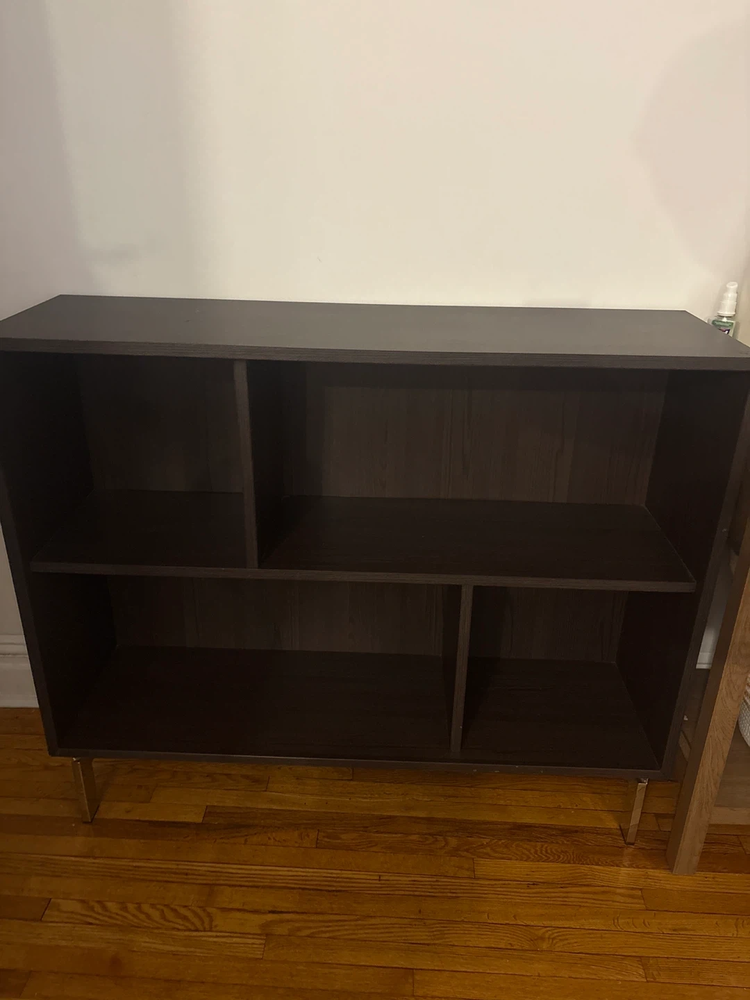 Selling a dark brown bookshelf in good condition. It has a modern design with multiple compartments for storage and display. Perfect for organizing books, decorations, or other items. Its sturdy construction ensures durability and stability
