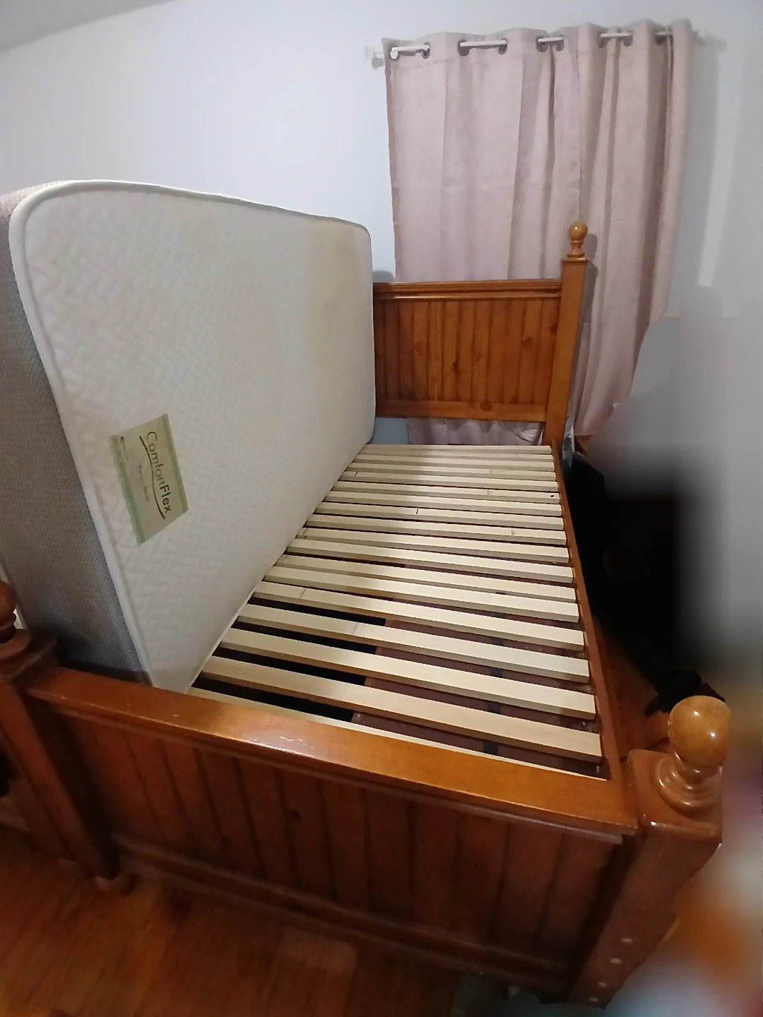 Selling a solid wood bed frame with ! ComfortFlex mattress . The bed frame has a classic design with a warm wood finish. The mattress is in good condition and offers comfortable support. Perfect for a bedroom upgrade!