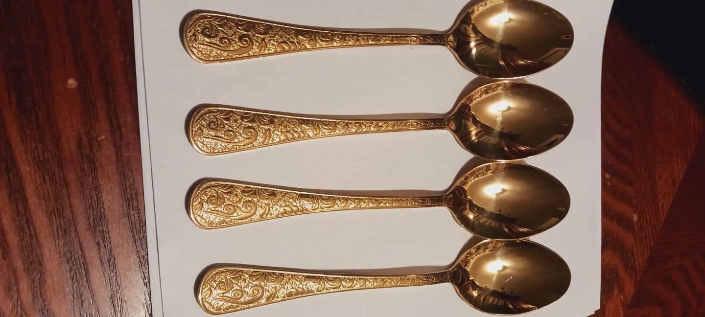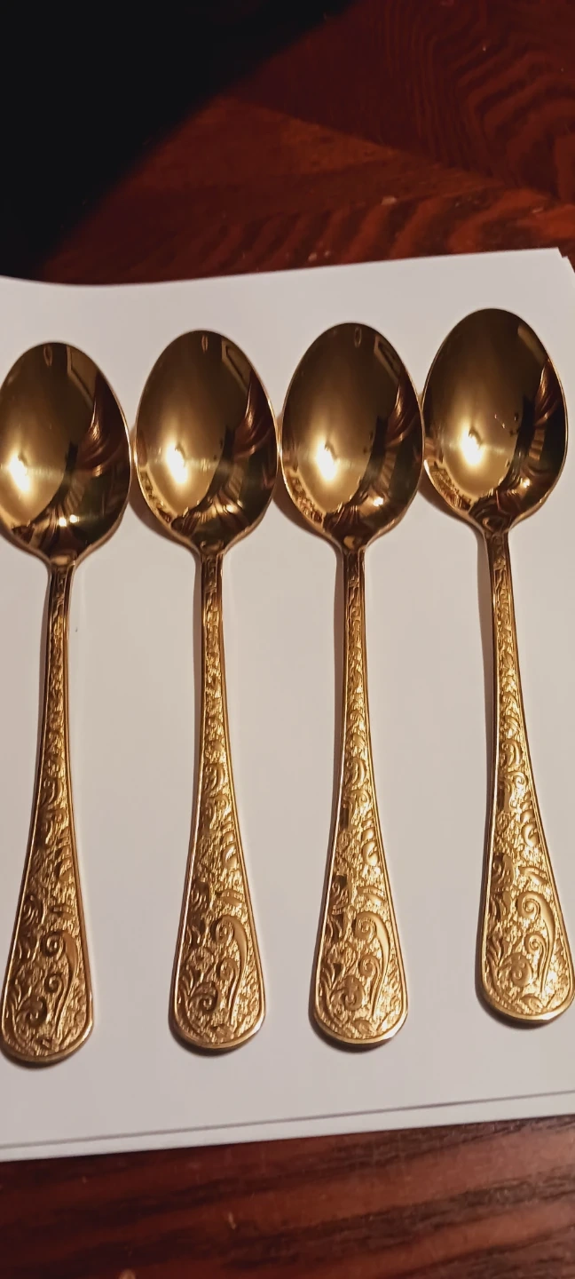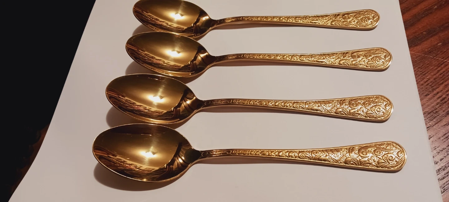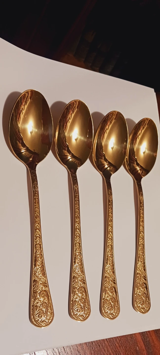 1000+NEW !!! Here's a set of four beautiful gold-plated spoons. They feature an ornate design on the handles, adding a touch of elegance to any table setting. These spoons are perfect for everyday use or special occasions!!! New !! ALL MY PRICES ARE NEGOTIABLE !!! 8"×2". New !! Never been used !!
