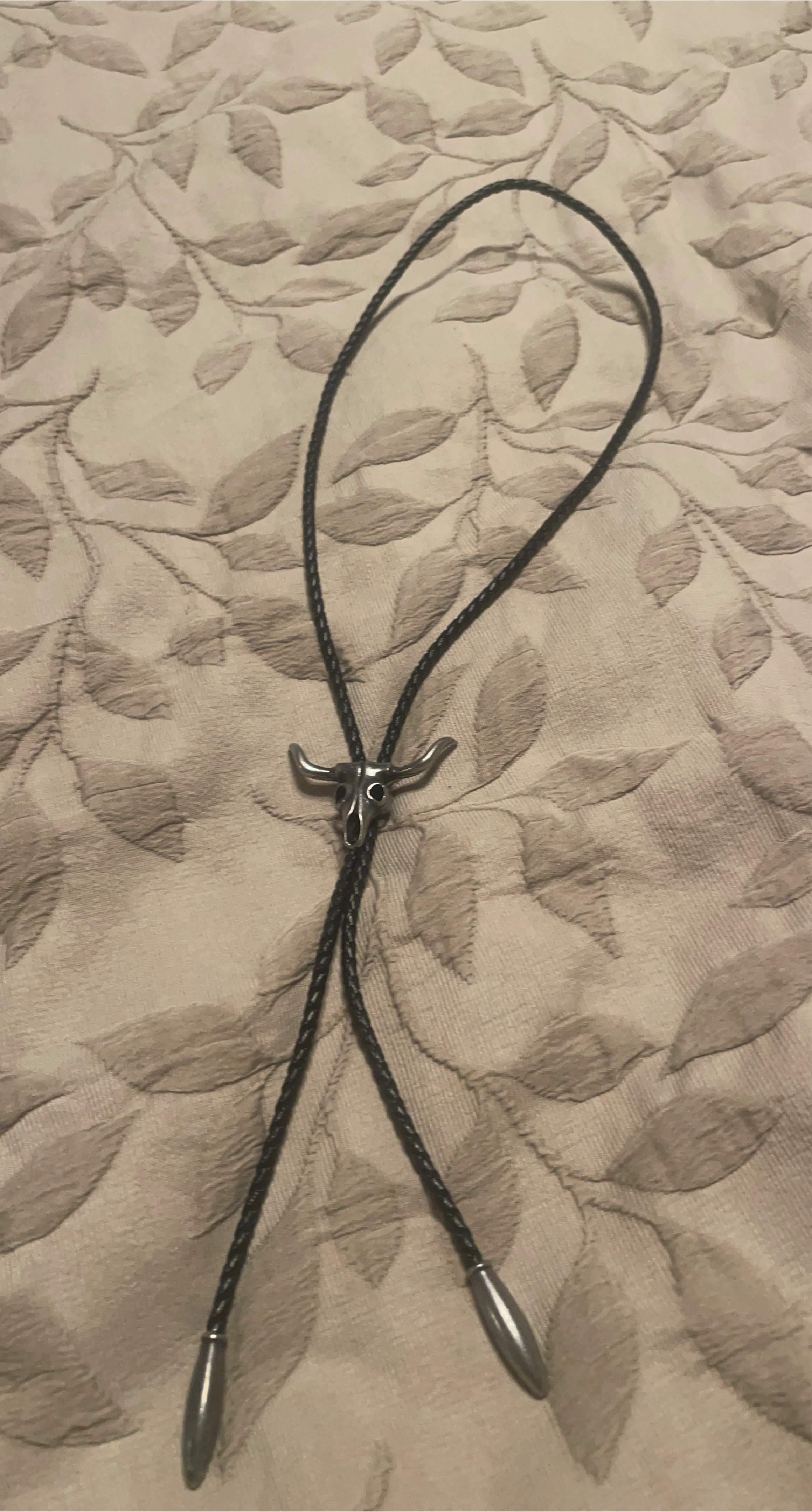 Buy & SellBolo Tie with Bull SkullBolo Tie with Bull Skull$10Here's a cool bolo tie featuring a bull skull design! It's in great condition and has a braided black cord with silver-tone tips. Perfect for adding a touch of Western flair to any outfit0 chats·0 favorites·1 viewsSELLERverifiedLeaWest Brighton650 reviewsWHERE TO MEETWest Brighton