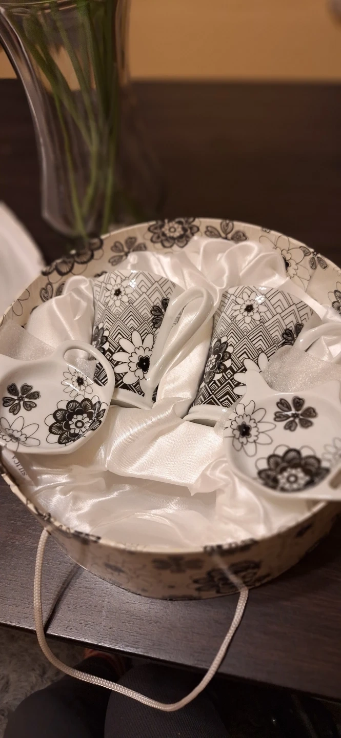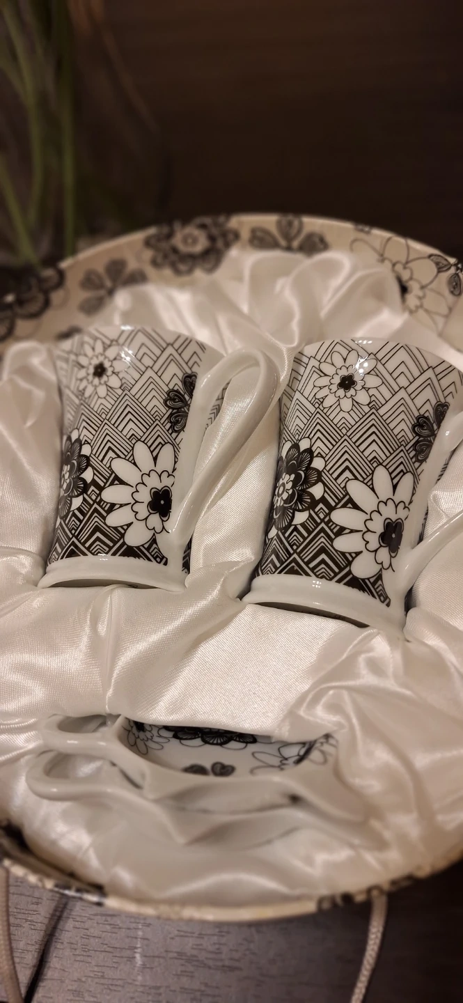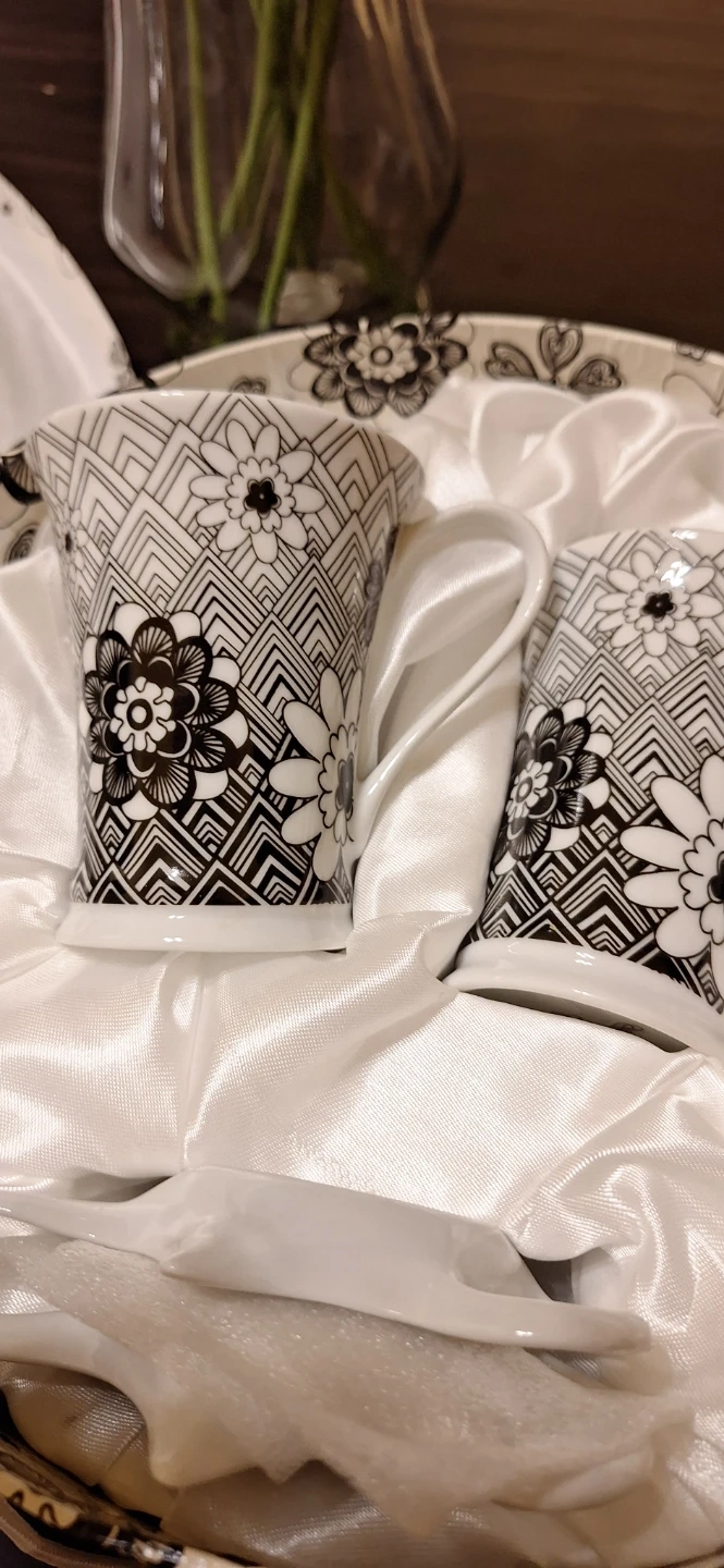 This is a La Cafetiere set of two espresso cups and saucers in a decorative box. The cups and saucers feature a stylish black and white floral and geometric pattern. Perfect for enjoying your favorite espresso!