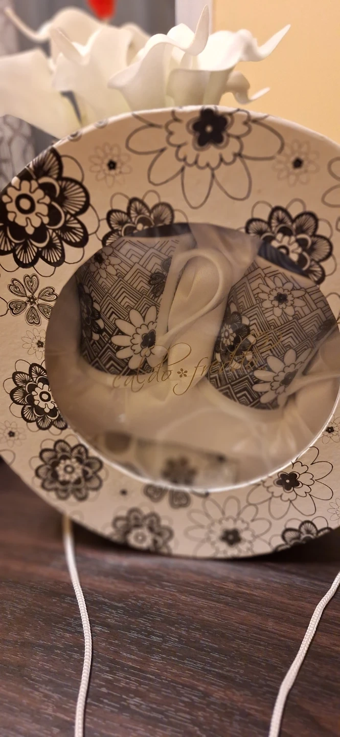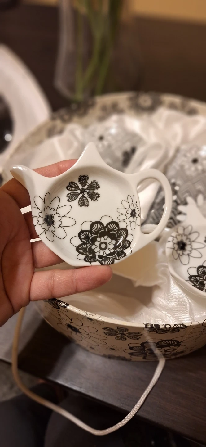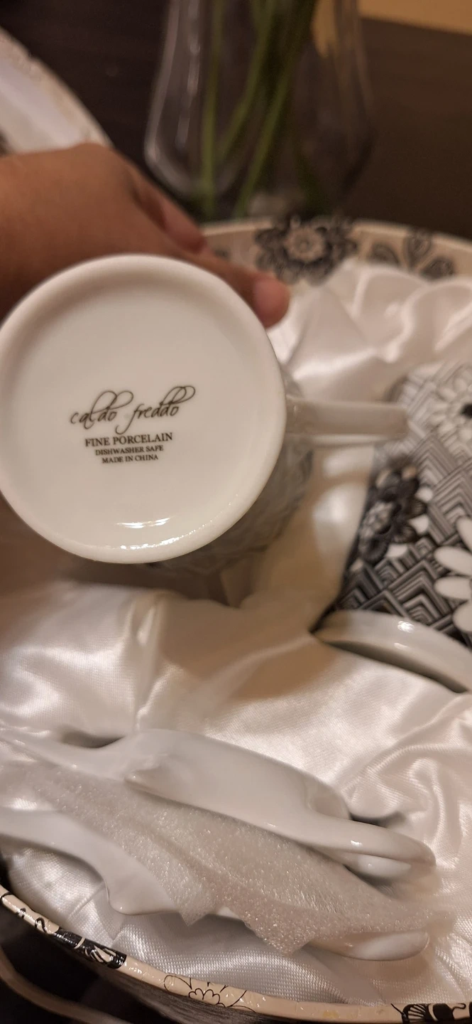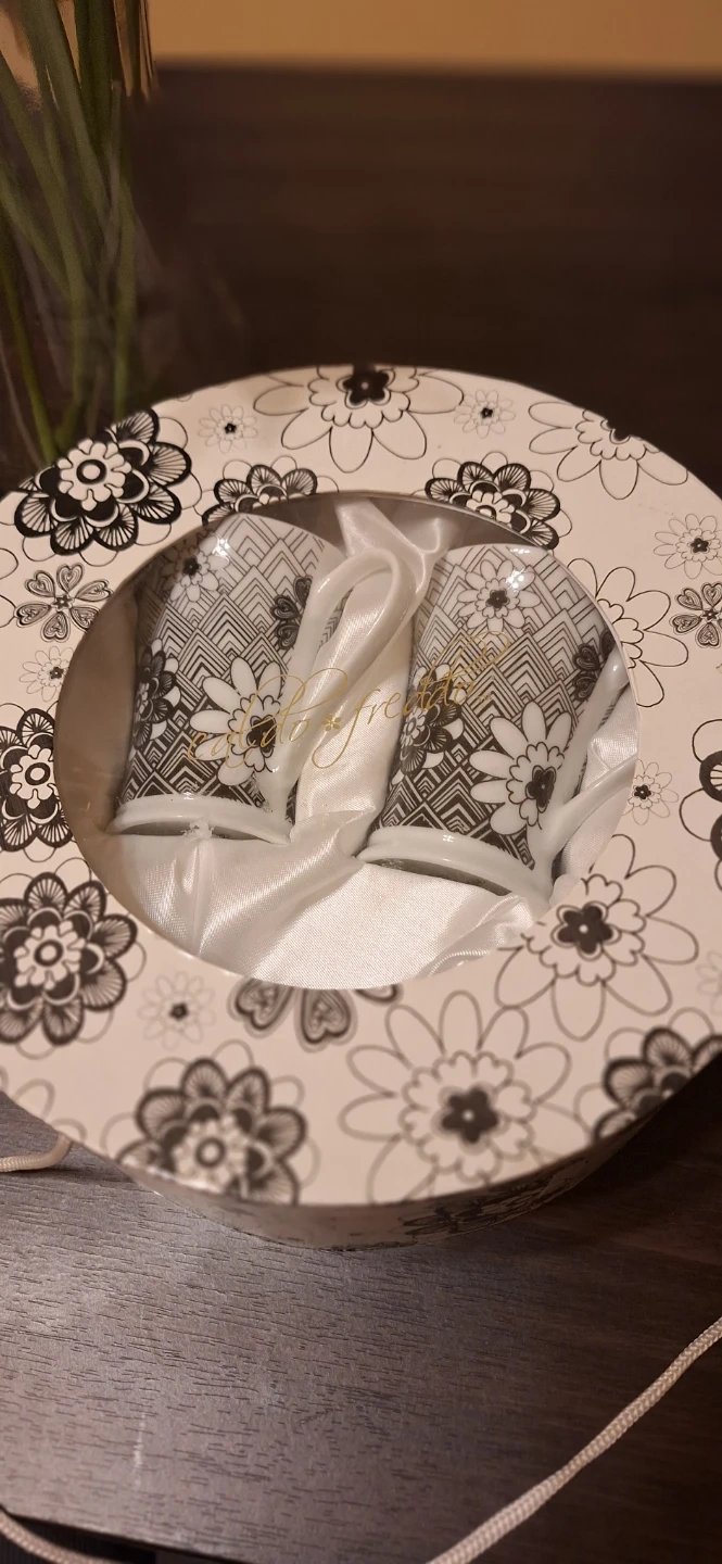 This is a La Cafetiere set of two espresso cups and saucers in a decorative box. The cups and saucers feature a stylish black and white floral and geometric pattern. Perfect for enjoying your favorite espresso!