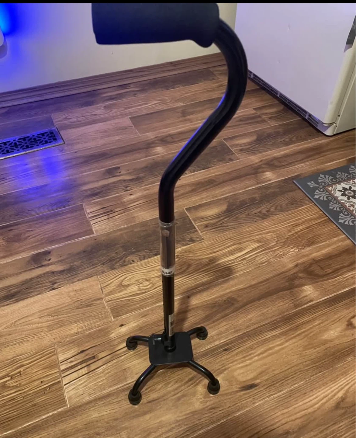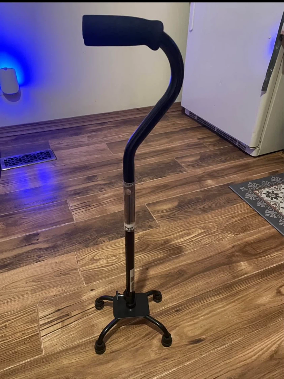 60Selling a quad cane in new condition. It has a black finish and a comfortable handle. Perfect for anyone needing a little extra support!