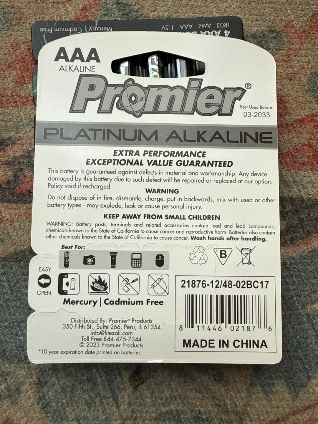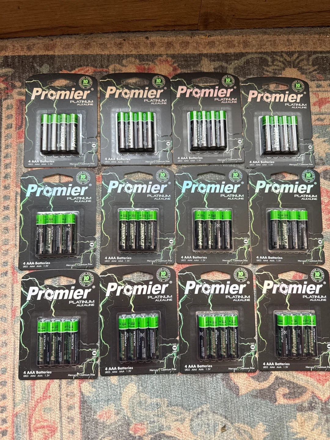 Selling a full box of Premier Platinum Alkaline AAA batteries. Each pack contains 4 batteries, and there are 12 packs in the box, for a total of 48 batteries. The best before date is March 2033, so they're fresh and ready to use! Retails for close to $40 brand new.
