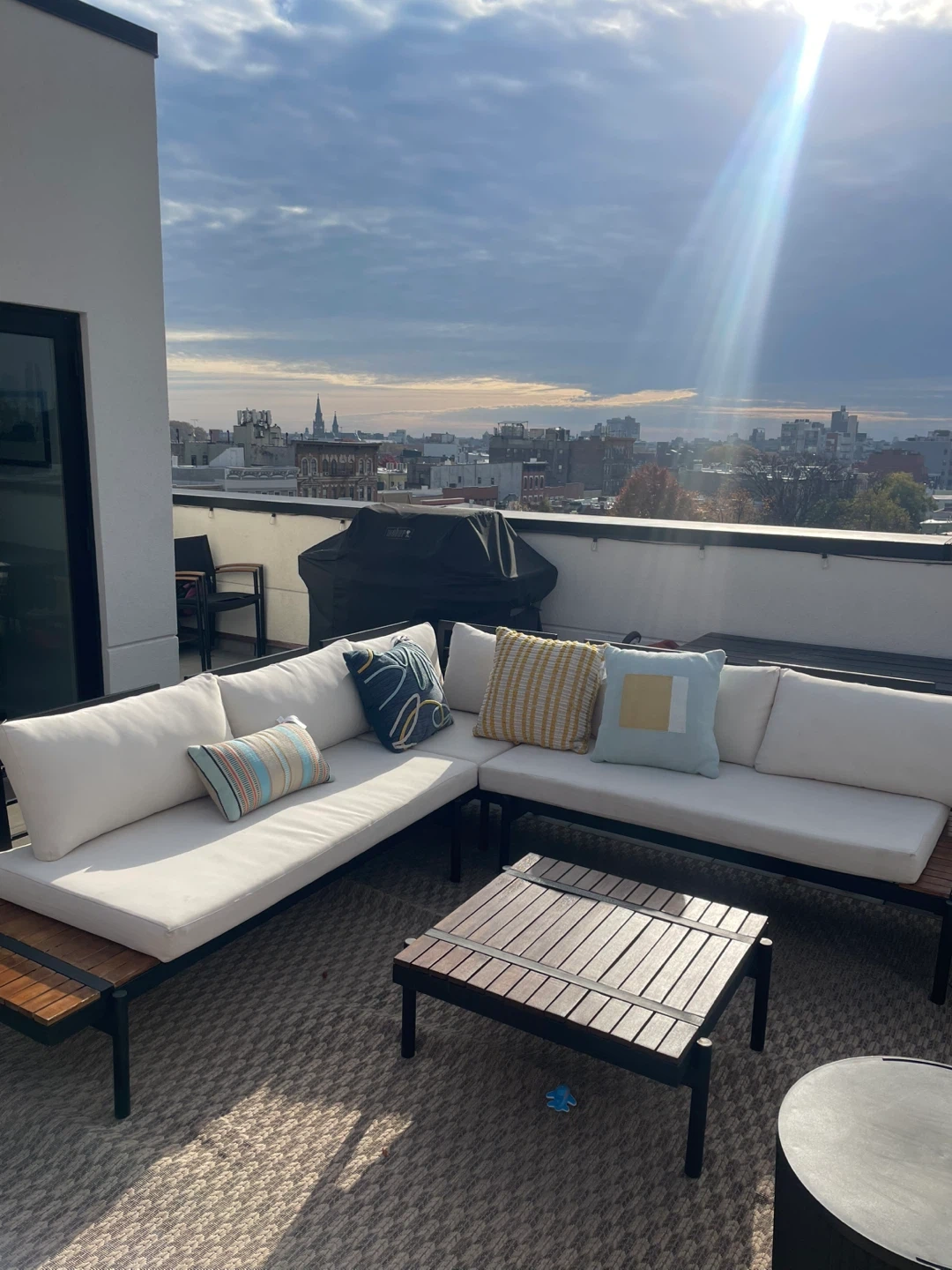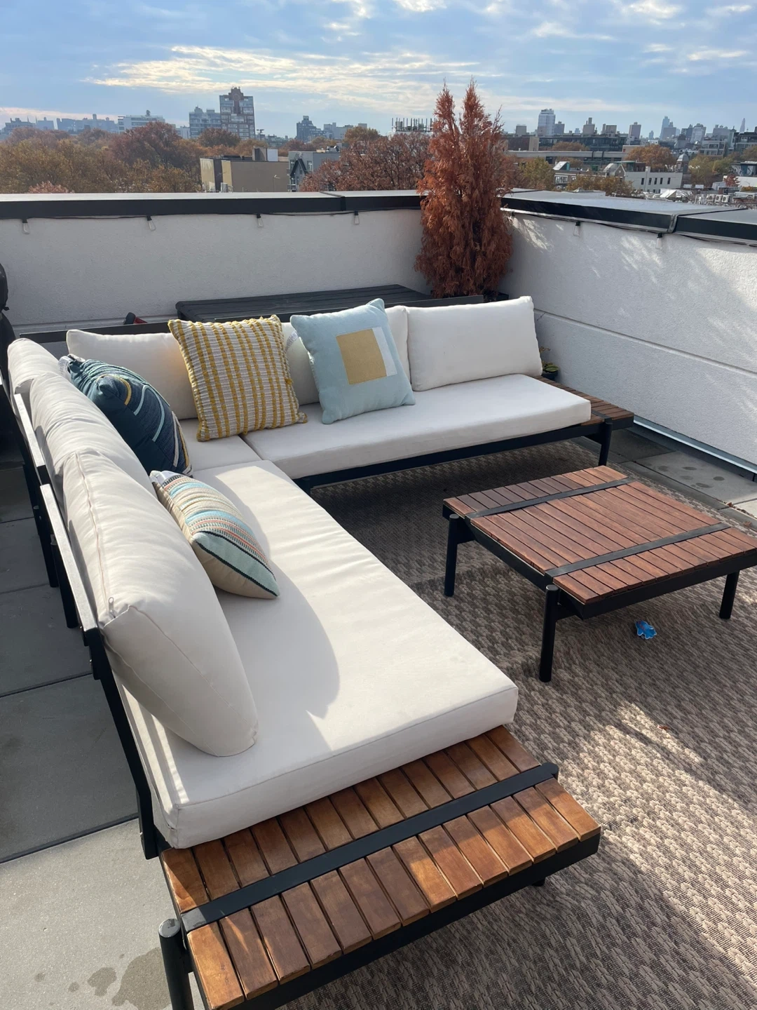 This is a stylish outdoor sectional sofa set with a coffee table. It features a modern design with a white cushioned sofa and a wooden coffee table. Perfect for relaxing on your patio or deck!