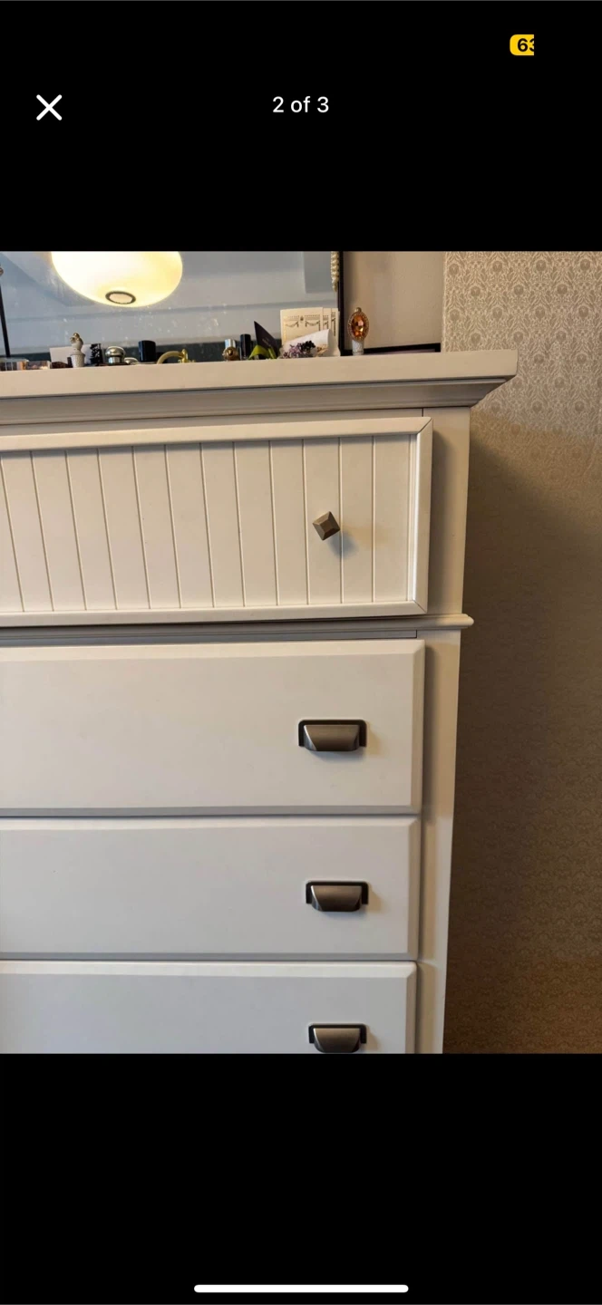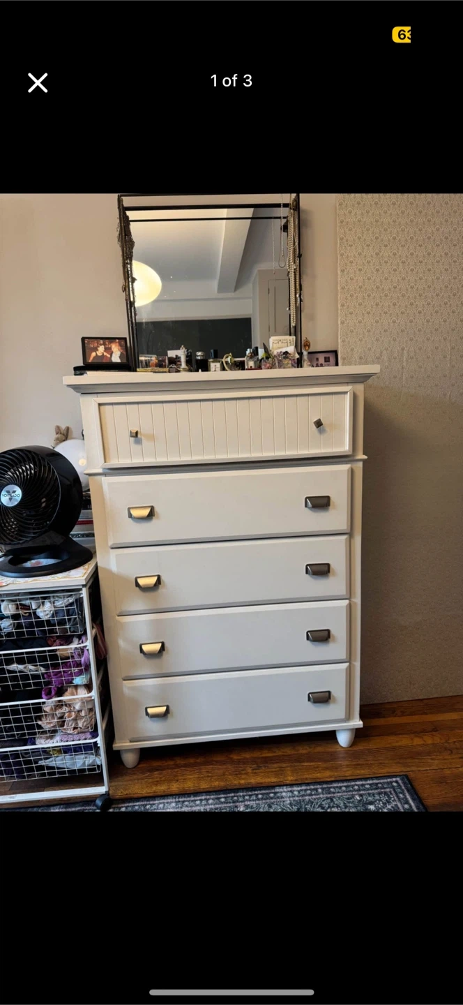 Selling a charming white 5-drawer dresser, perfect for adding a touch of elegance to any room! It features a top section with a flip-up mirror and a good amount of storage space. There is a small chip on the edge, as shown in the pictures.