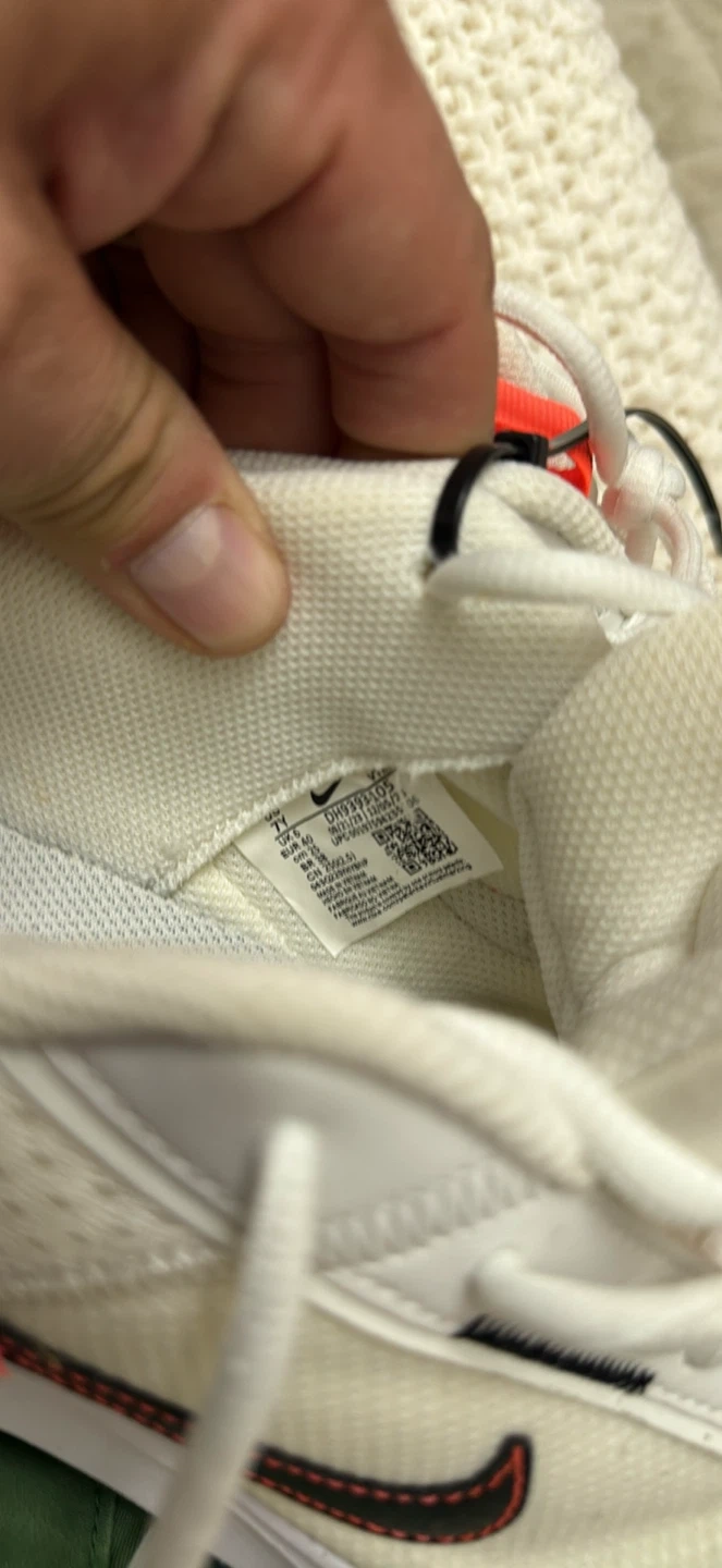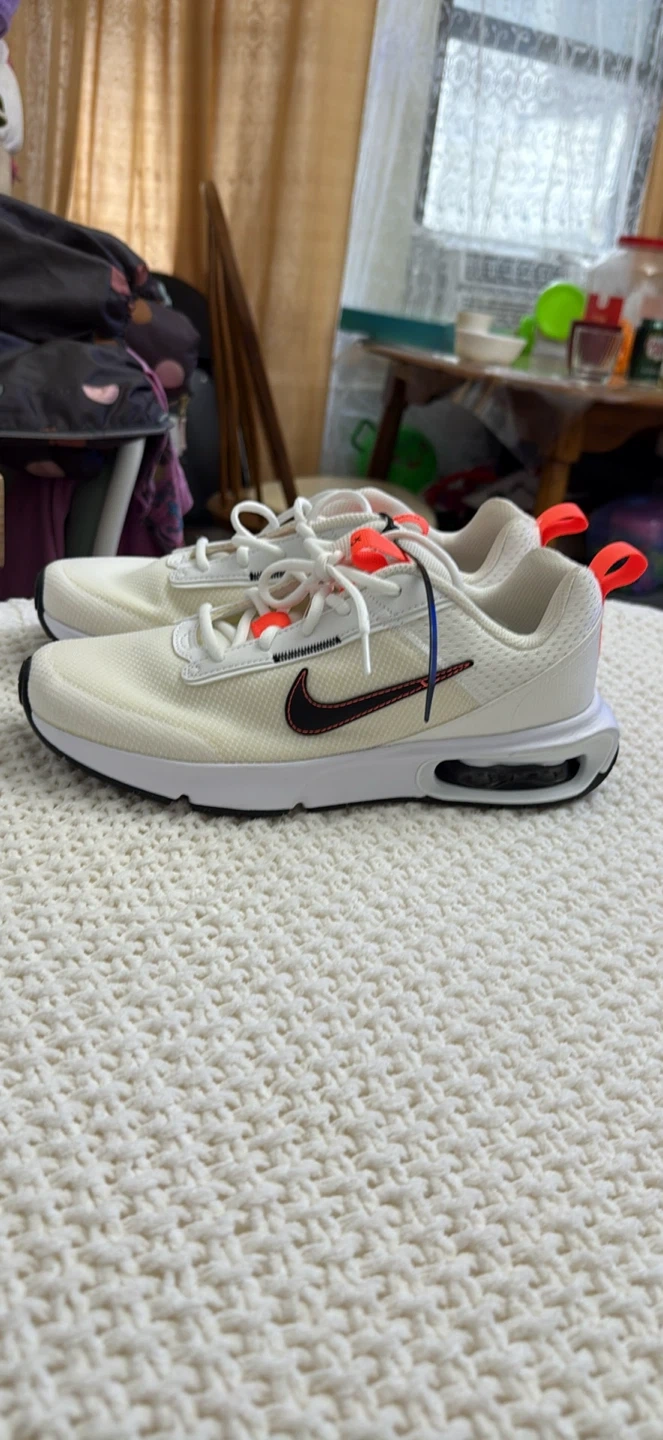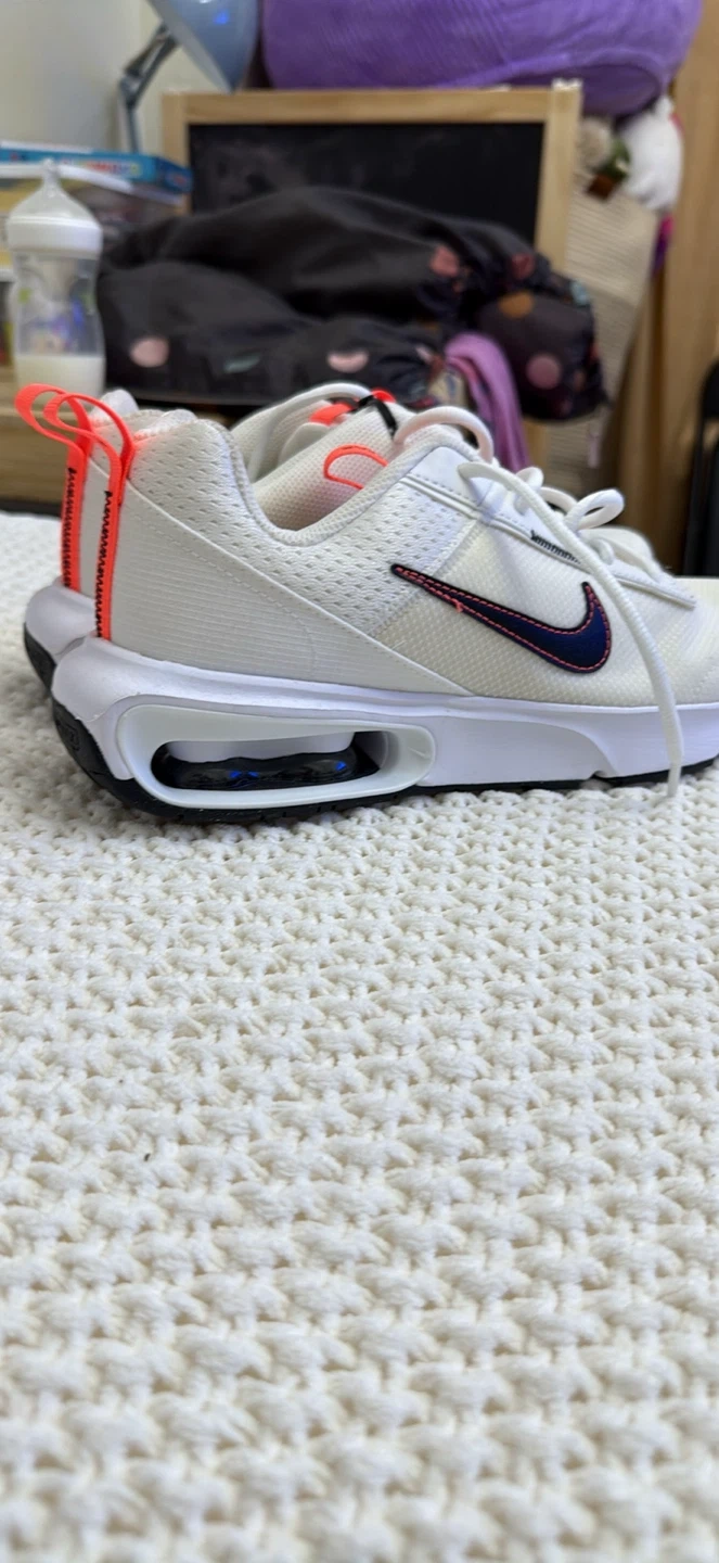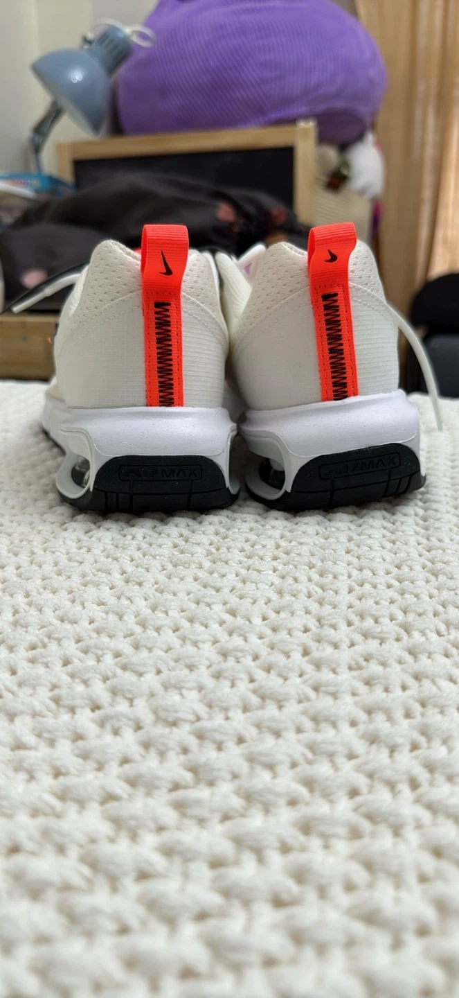 Selling a pair of Nike Air Max sneakers! They're white with an orange accent on the tongue and back. The Nike swoosh is a dark navy color. These are in great condition and ready for a new home!