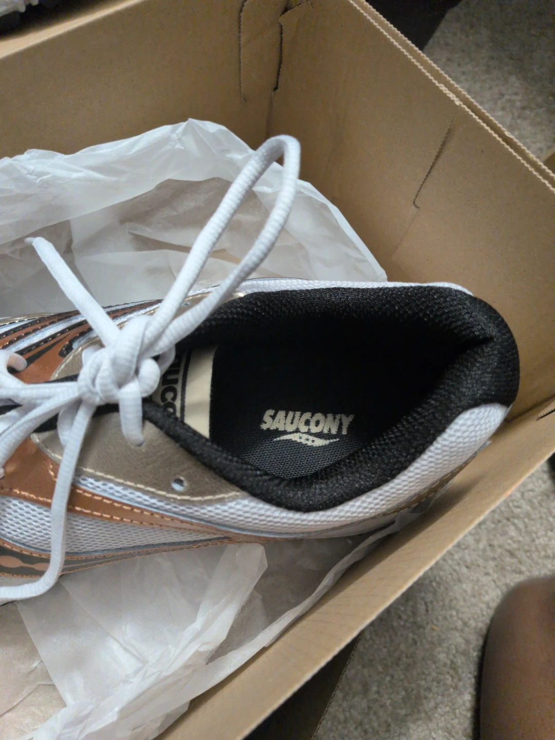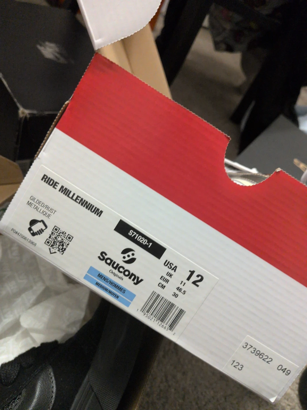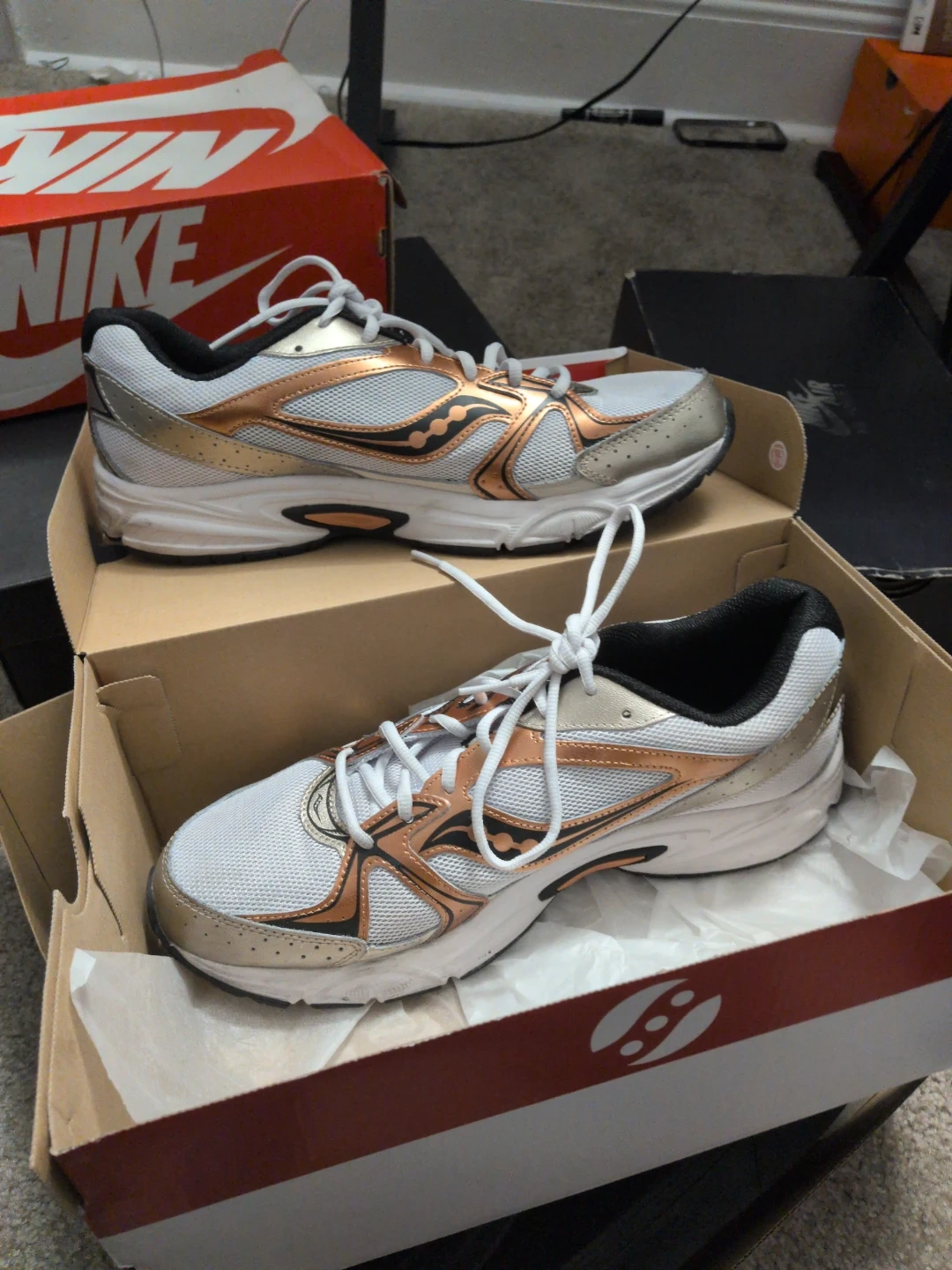 10Selling a pair of Saucony Ride Millennium running shoes for men in size 12. These shoes come in their original box. They feature a stylish design with a mix of white, gold, and black accents. Perfect for running or casual wear!