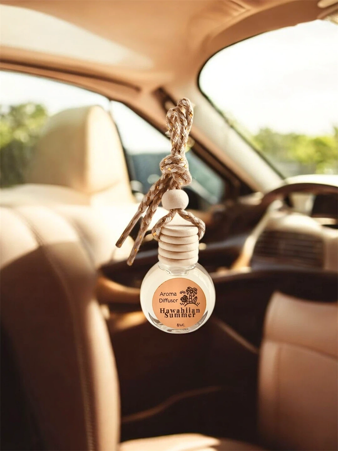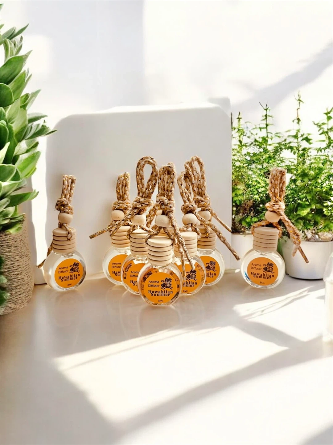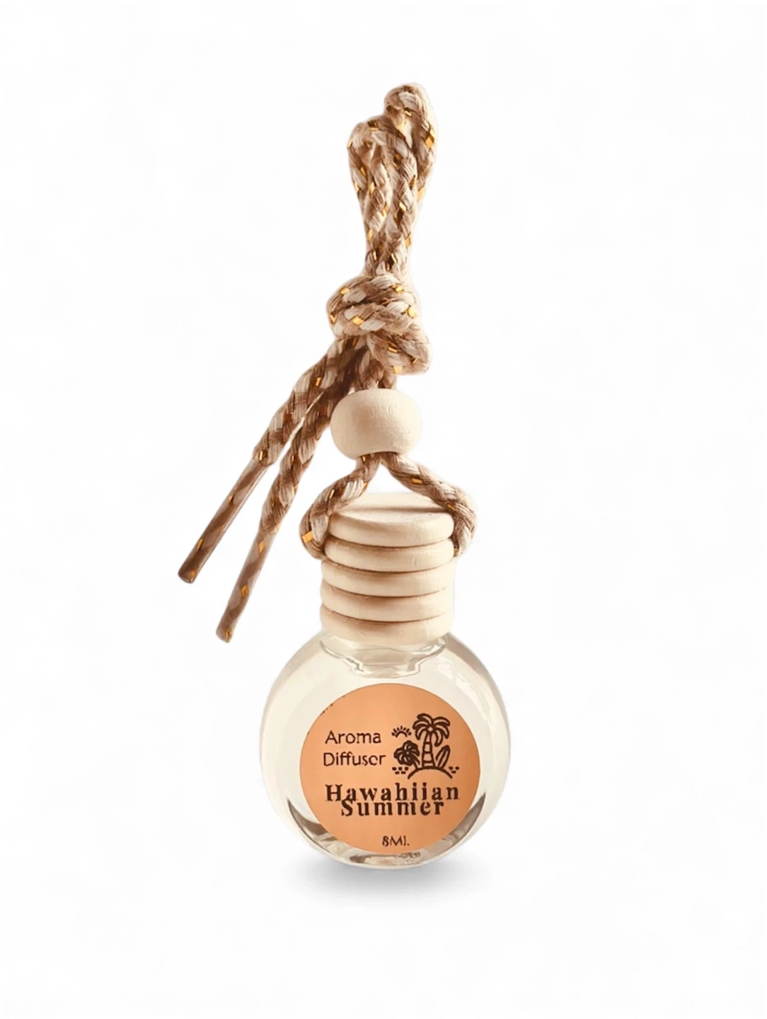 This is an 8 ml aroma diffuser with a Hawaiian Summer scent! It's perfect for adding a pleasant fragrance to your car or small space. The diffuser has a wooden lid and comes with a cord for easy hanging. It measures approximately 1.1 inches in diameter and 1.93 inches in height.