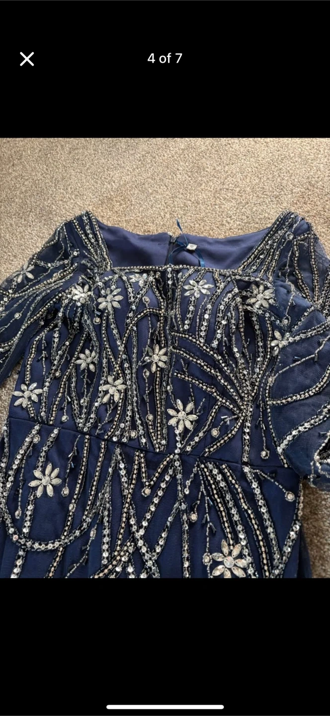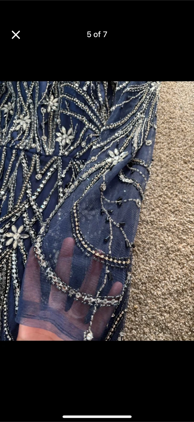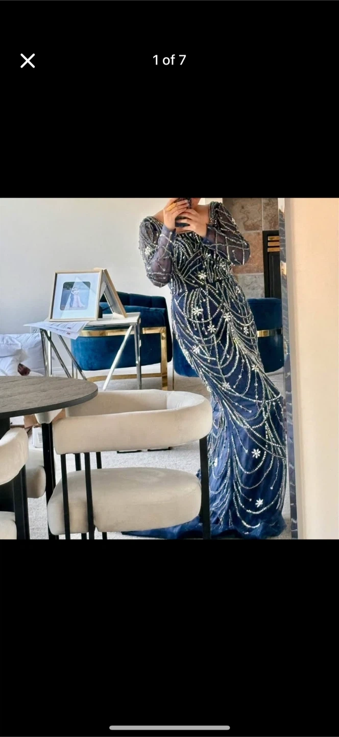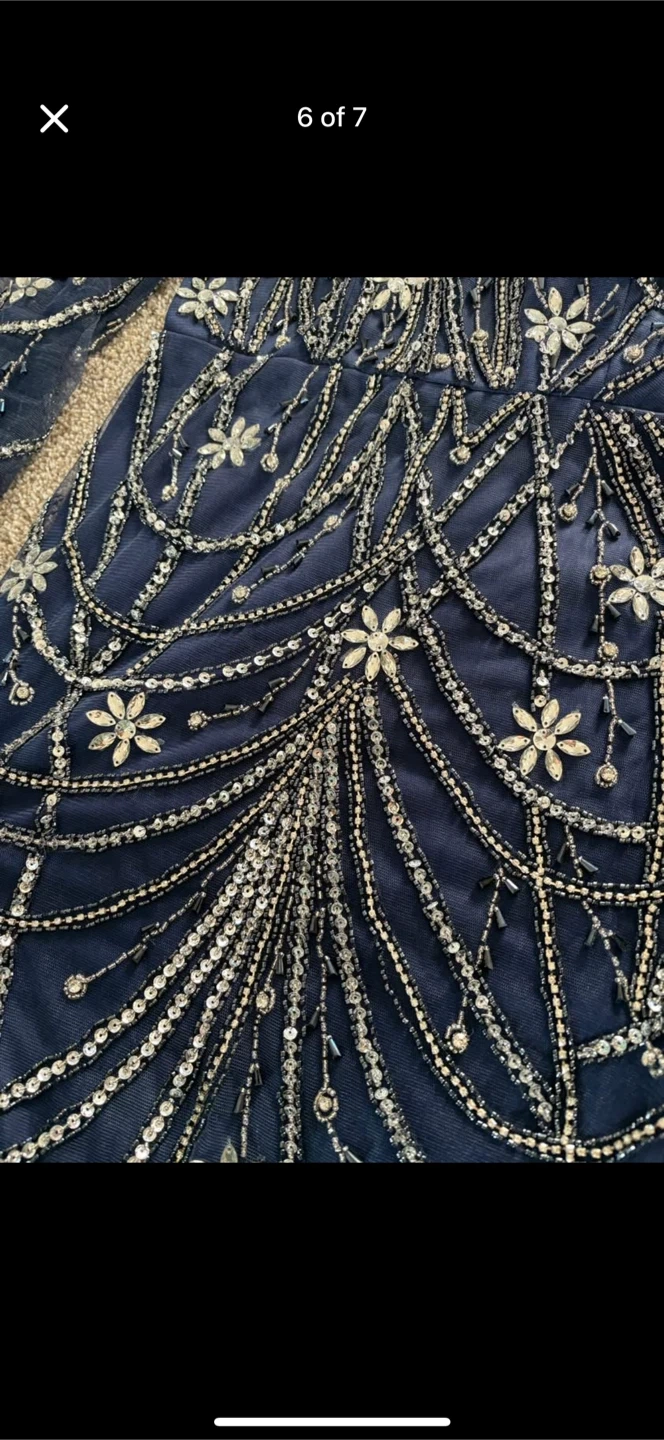 Beautiful navy blue gown with silver embellishments! It's a stunning piece that would be perfect for a special occasion. The long sleeves and intricate detailing make it a real showstopper