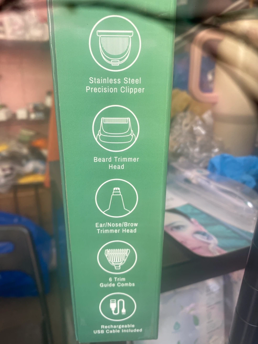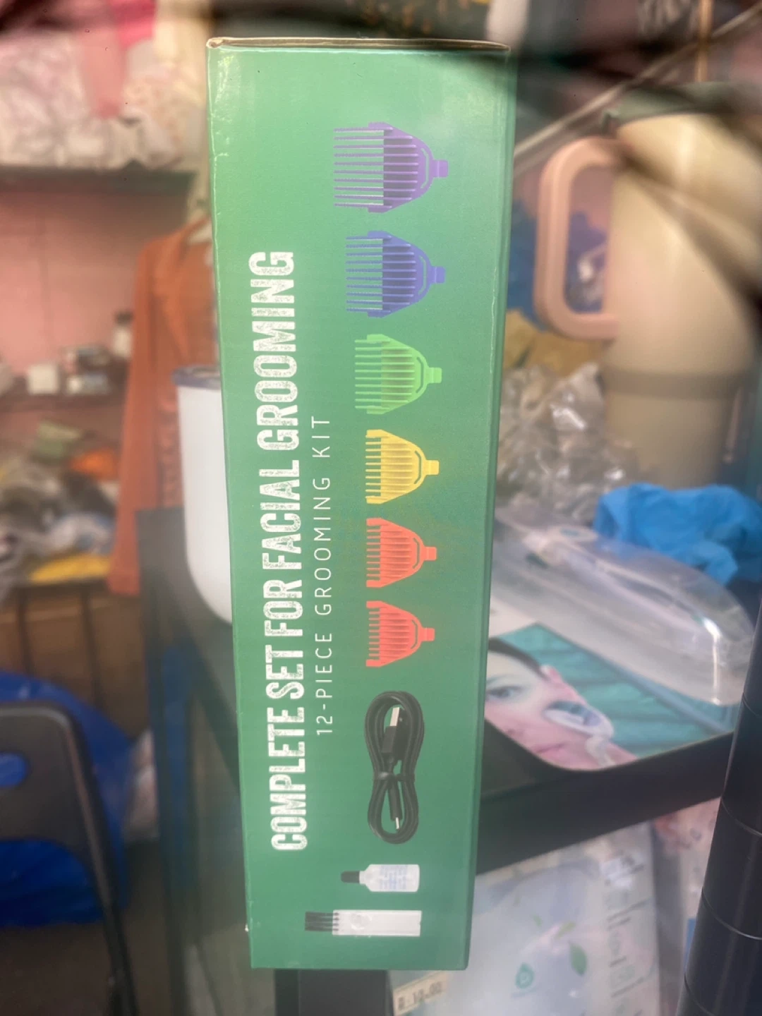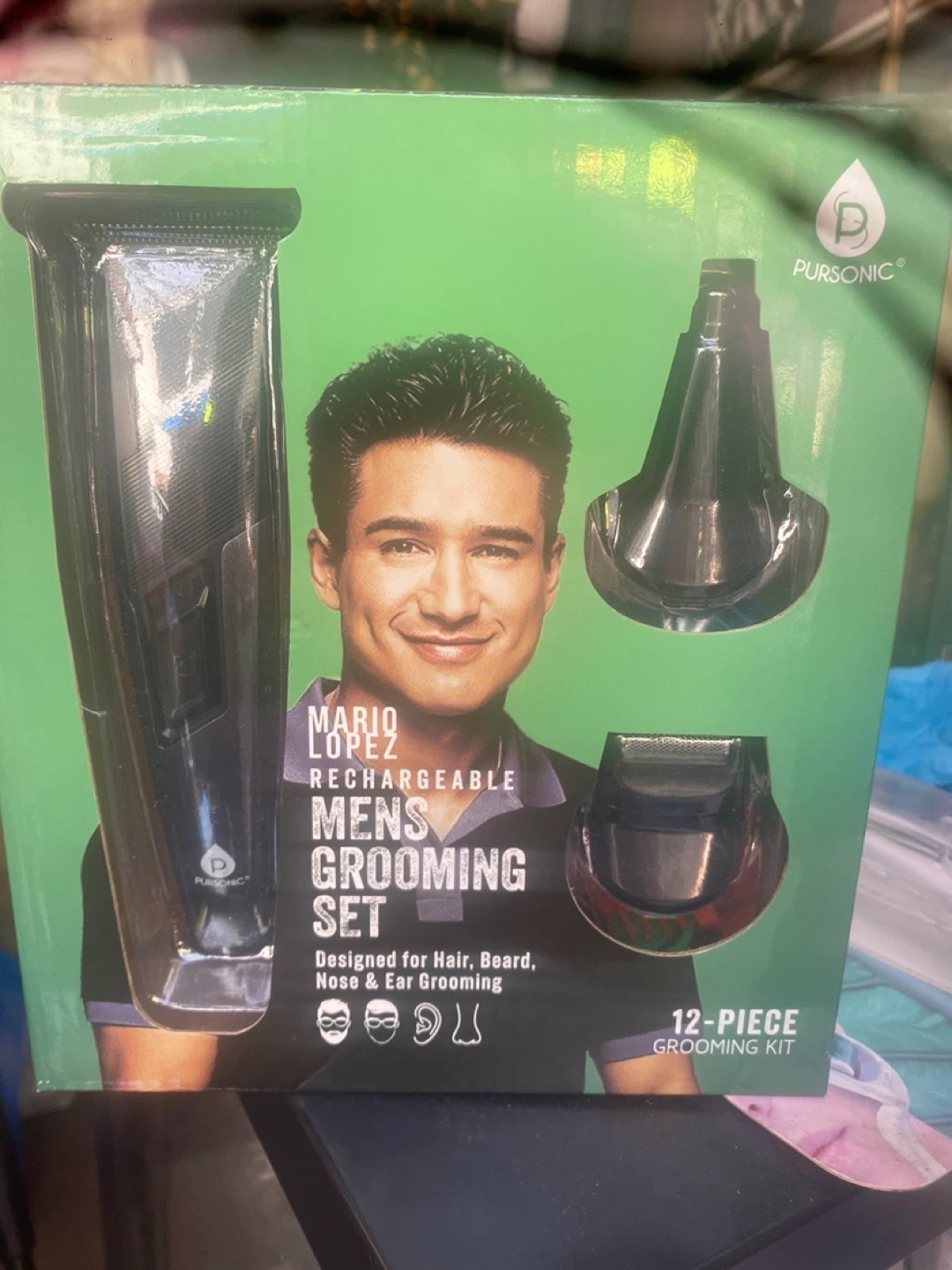 I'm selling a brand new Pursonic Mario Lopez Rechargeable Men's Grooming Set! This 12-piece grooming kit is designed for hair, beard, nose, and ear grooming. It includes a stainless steel precision clipper, beard trimmer head, ear/nose/brow trimmer head, and 6 trim guide combs. Also included is a rechargeable USB cable. Get everything you need for facial grooming in one complete set!