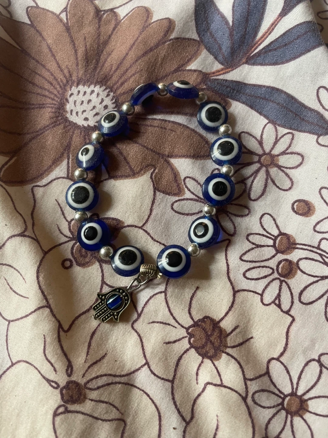 135This is a cute evil eye bracelet with a hamsa charm. It's in great condition and ready to wear!