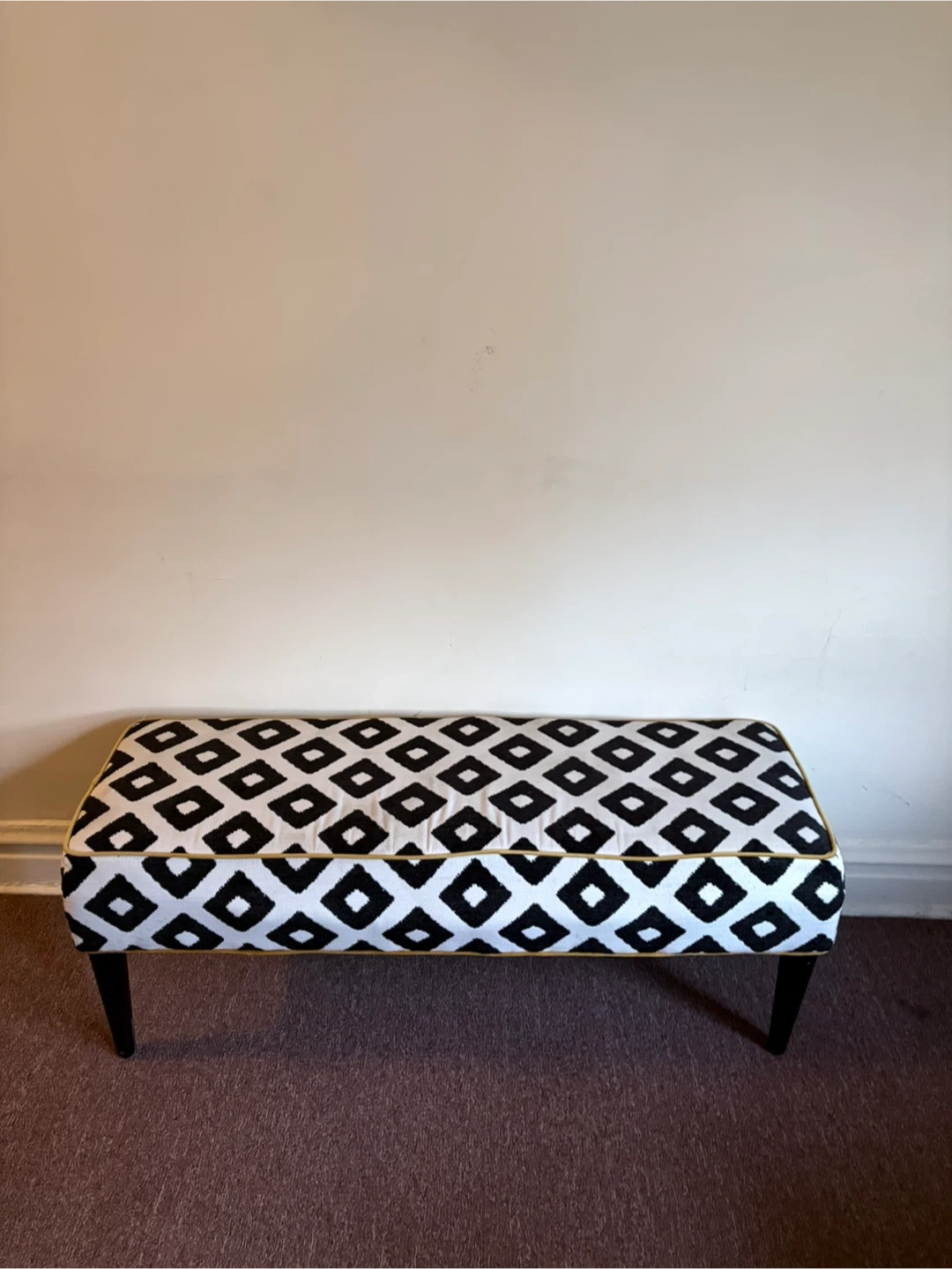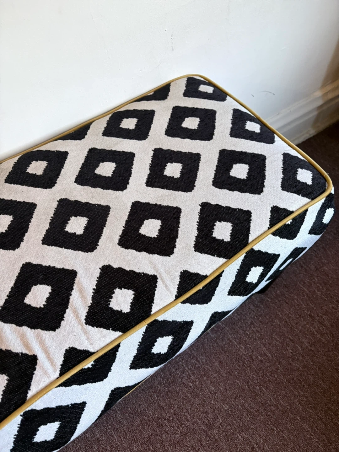 Selling a stylish bench with a black and white geometric pattern! It's in great condition and would be a lovely addition to any room adding a pop of color.