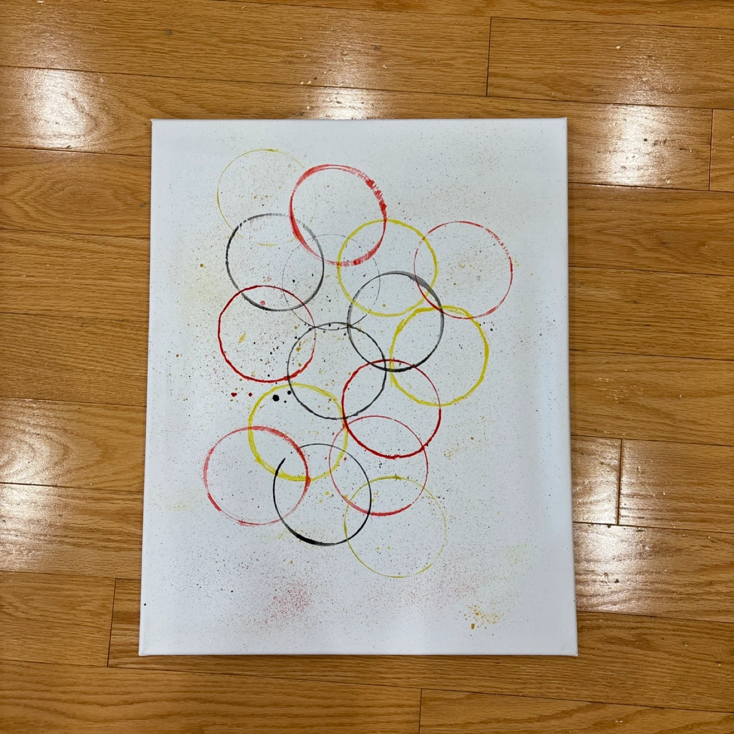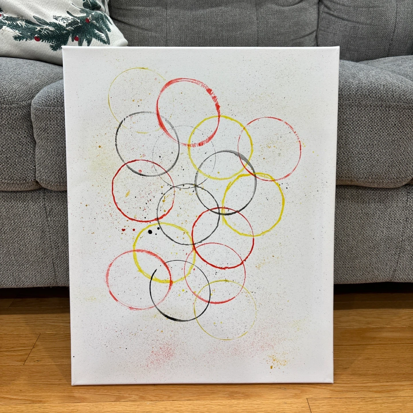 This is a unique piece of abstract art featuring overlapping circles in red, yellow, and black on a white canvas. It's perfect for adding a modern touch to any room. The painting is in great condition and ready to hang!