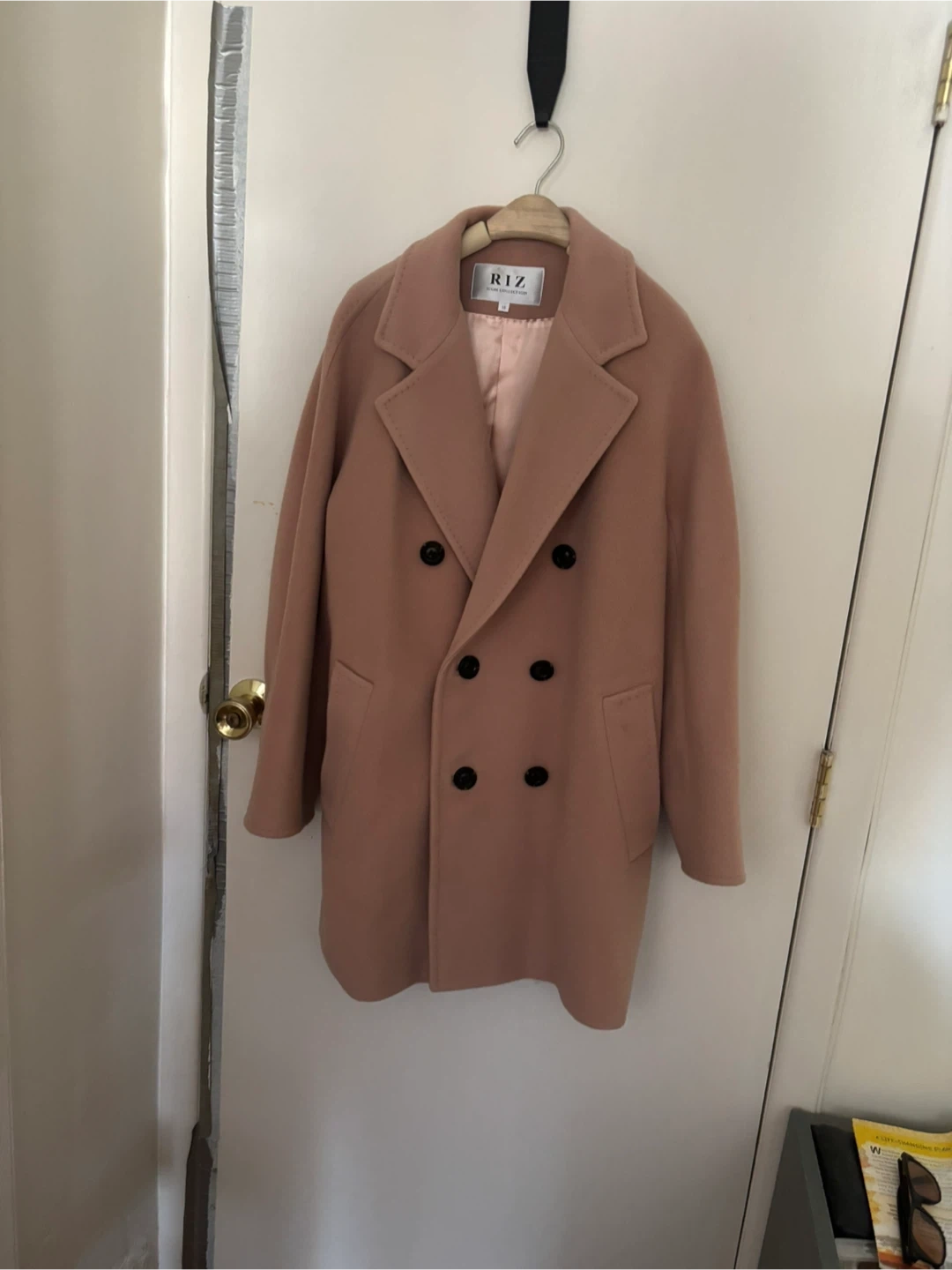 Selling a RIZ double-breasted coat in a beautiful light pink color! It's a size small and made with a wool blend, perfect for keeping warm. The coat is in great condition and ready for a new home