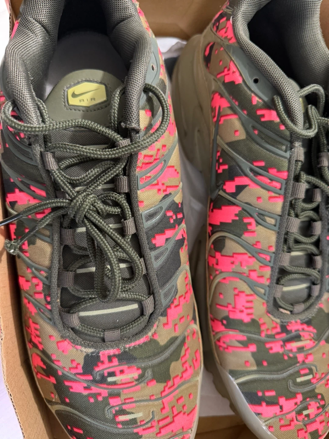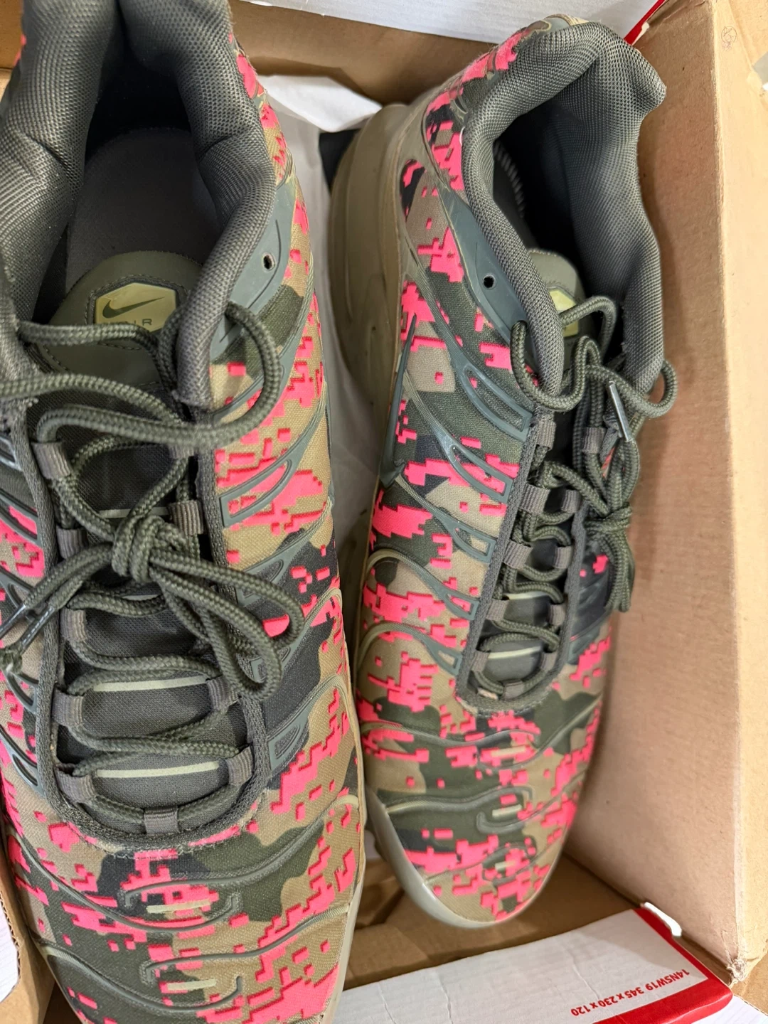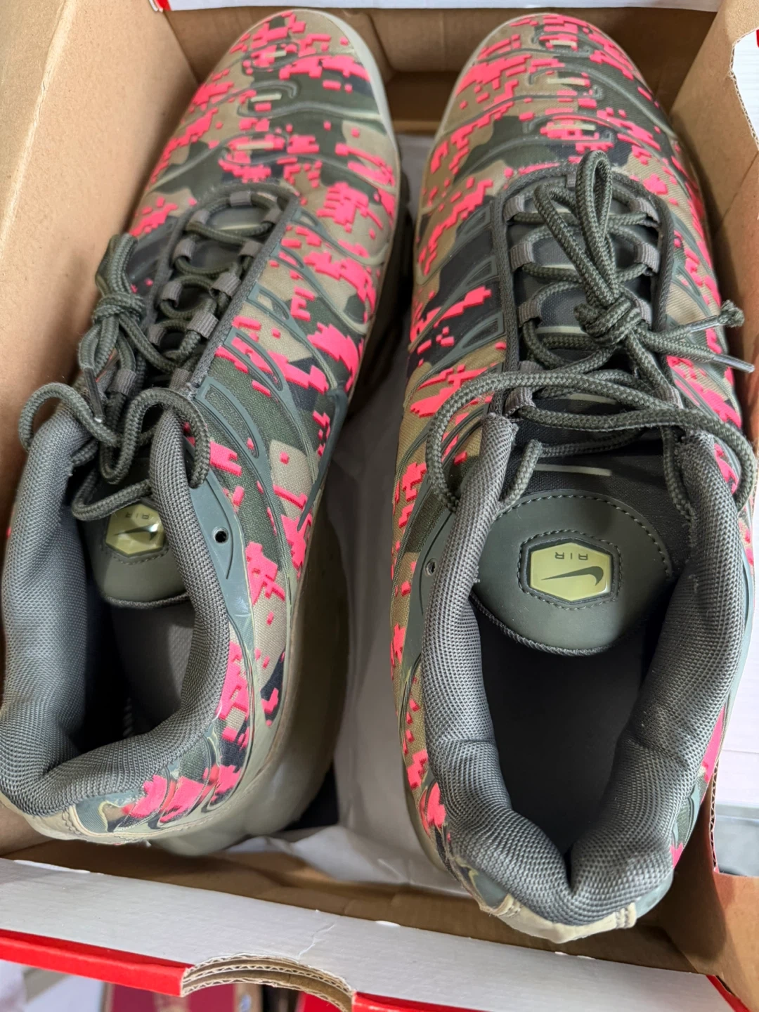 262Selling a pair of Nike Air Max Plus TN sneakers in US size 13. They feature a unique camouflage pattern with pink accents and are in good condition. The iconic 'TN' logo is visible on the heel and insole. These shoes are sure to make a statement!