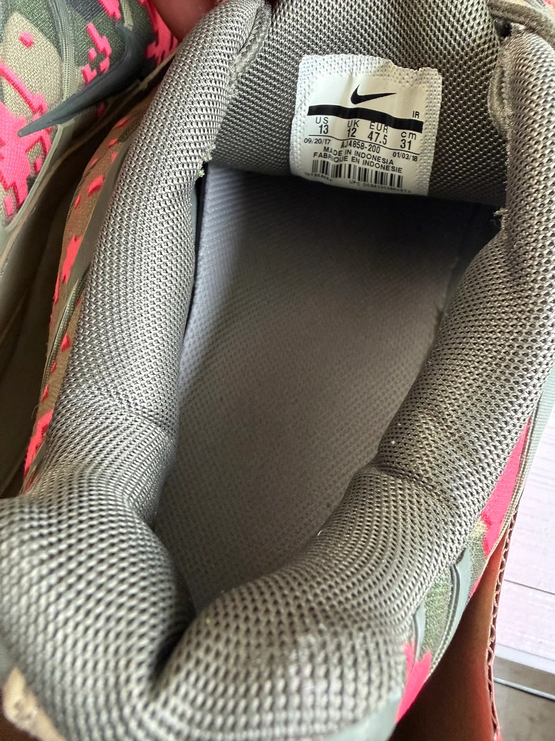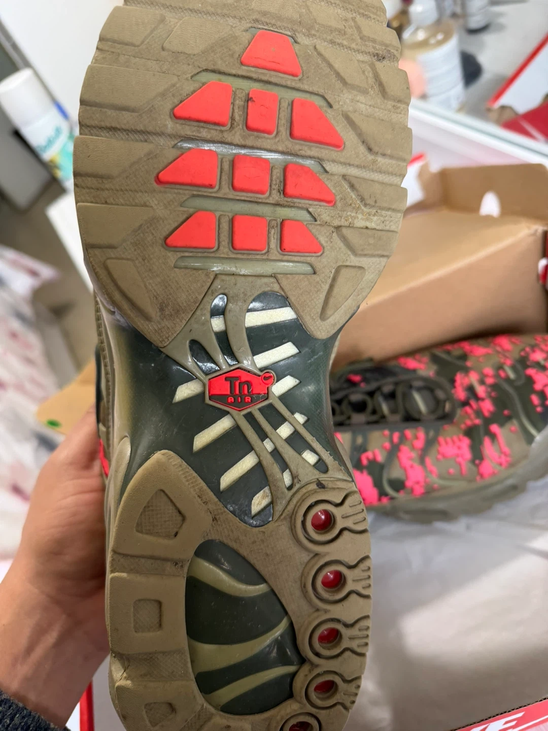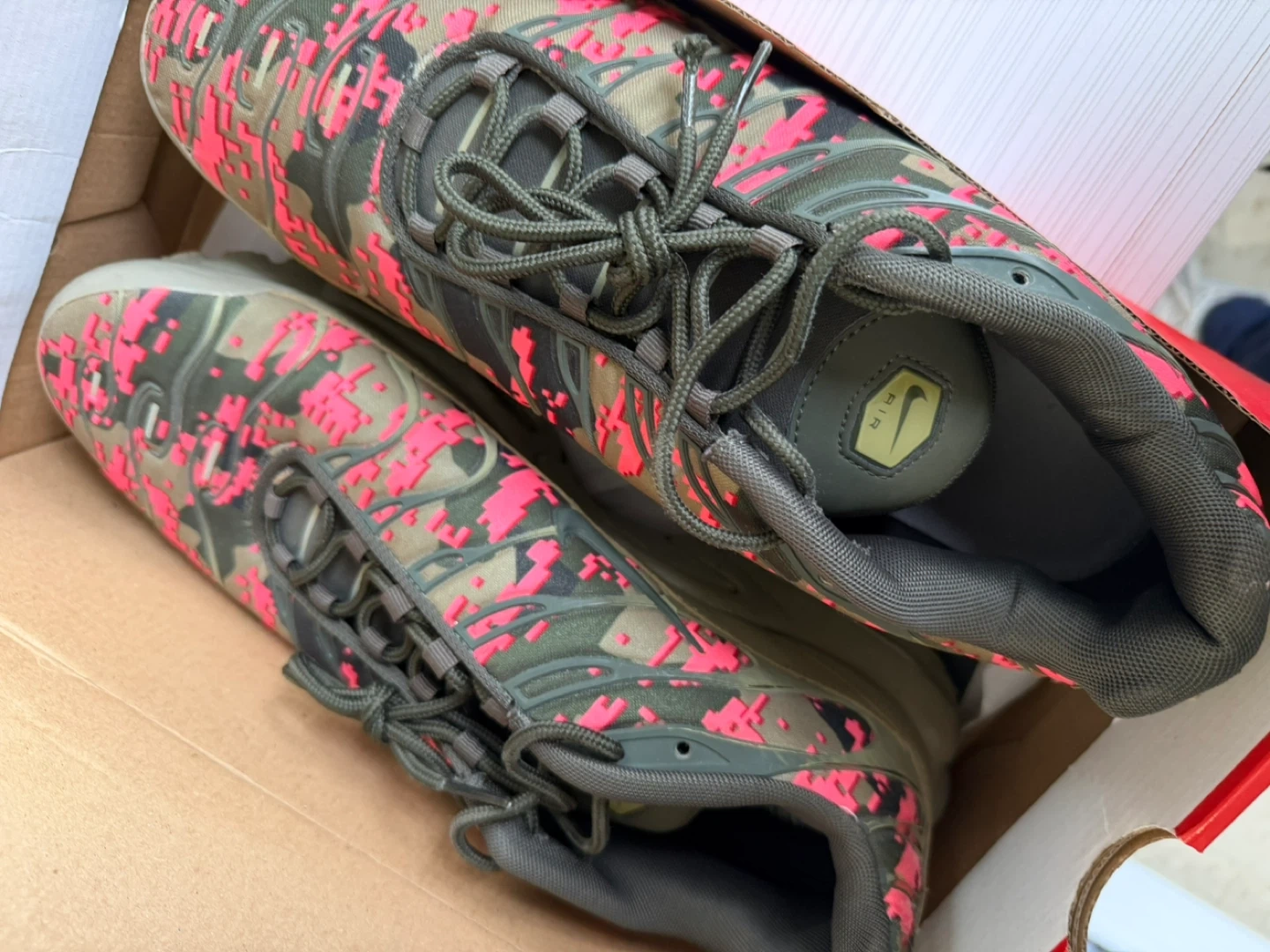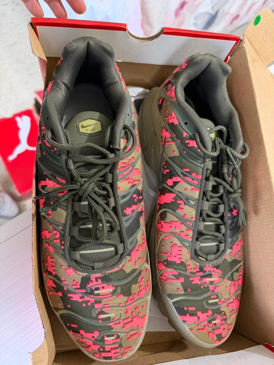 262Selling a pair of Nike Air Max Plus TN sneakers in US size 13. They feature a unique camouflage pattern with pink accents and are in good condition. The iconic 'TN' logo is visible on the heel and insole. These shoes are sure to make a statement!