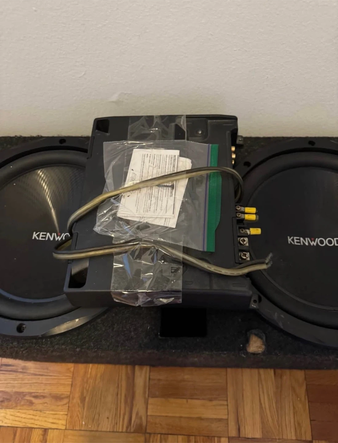 Two 12 inch Kenwood subs with a 1000 watt Kenwood amp, and the enclosure box. Subs are slightly used. Box is a bit older so it’s scuffed up in a few places but works fine.