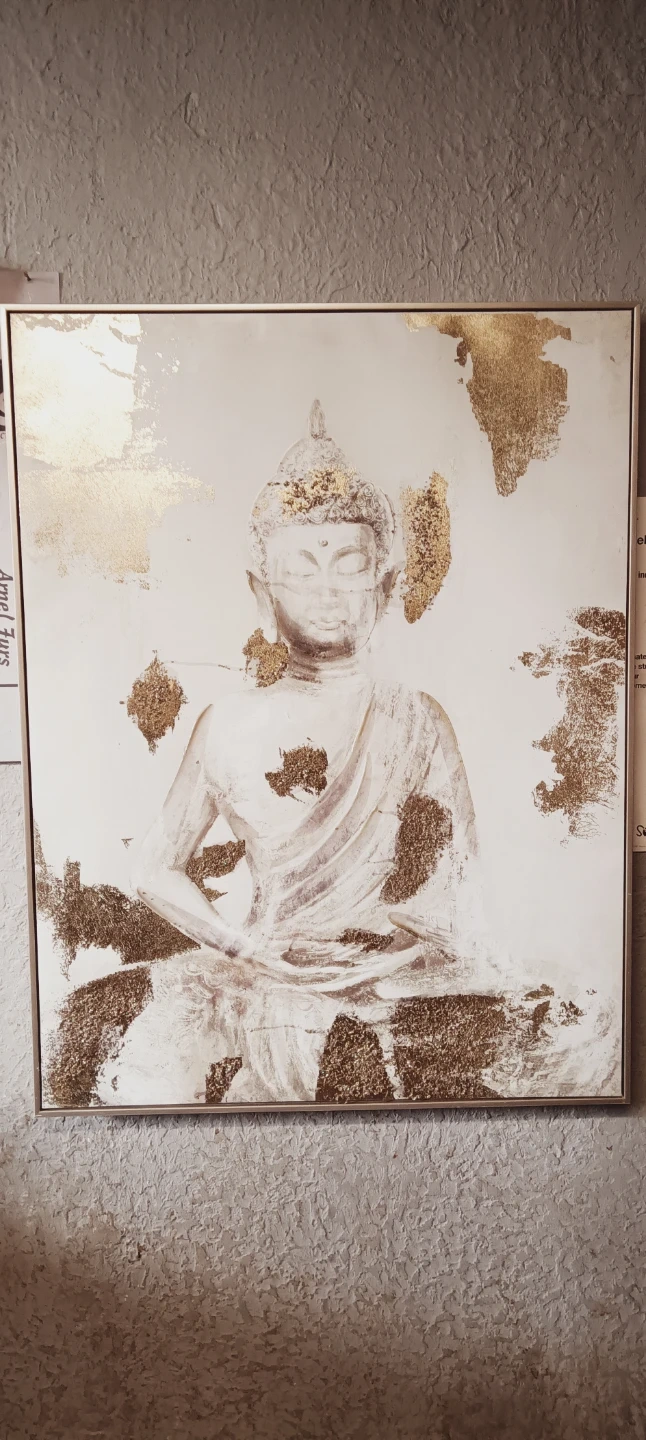 Beautiful canvas wall art featuring a Buddha design. It has a neutral color palette with gold accents that would complement any room. Perfect for adding a touch of serenity to your home decor