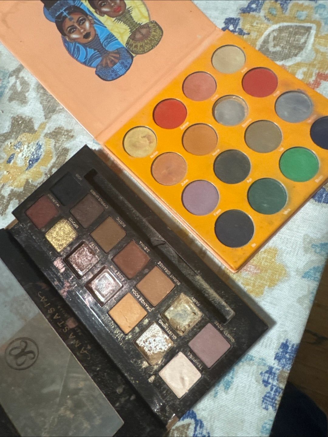 97Selling an Anastasia eyeshadow palette. The colors include bronze, sultry, rose pink, orange soda, glistening, and tempera. There are also shades like rustic, Sienna, burnt orange, fairy, dusty rose, and mulberry. The palette includes a Cyprus Umber shade as well