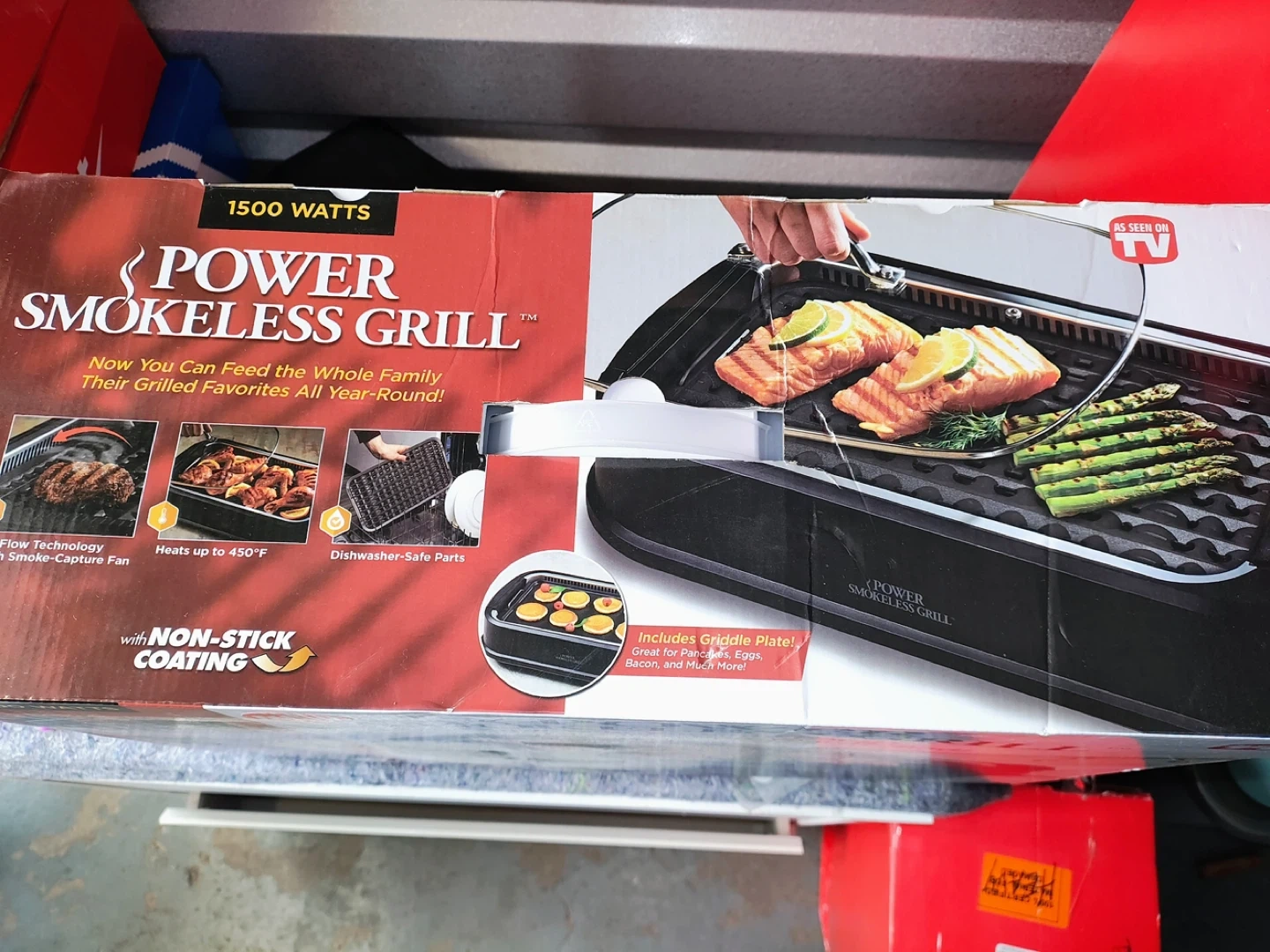 Get ready to grill your favorite foods year-round with the Power Smokeless Grill! This indoor electric grill features airflow technology with a smoke-capture fan, so you can enjoy grilling without the smoke. It heats up to 450°F for even, constant temperature cooking. Plus, it includes a griddle plate, perfect for eggs, bacon, and more! The non-stick coating and dishwasher-safe parts make clean-up a breeze