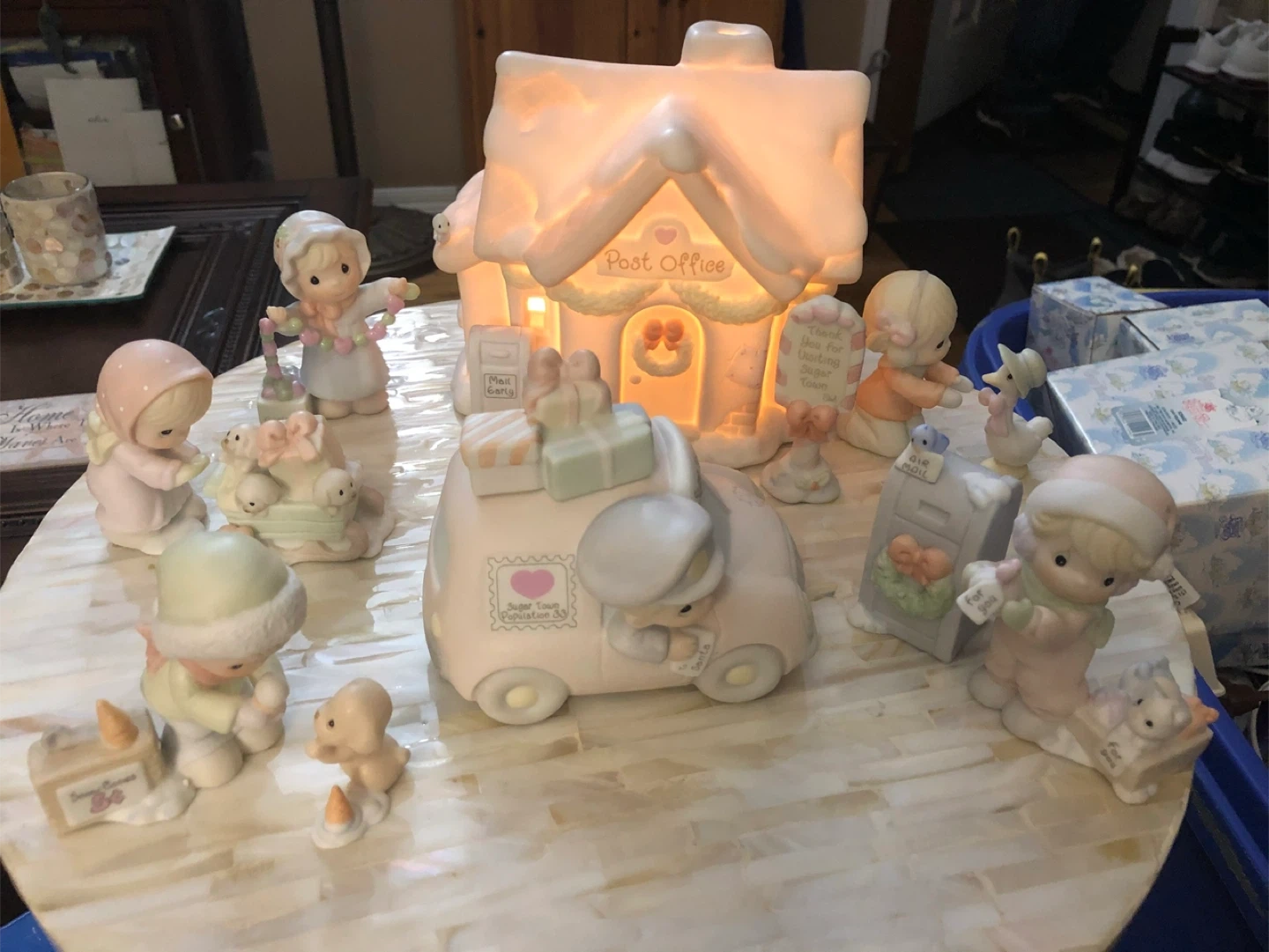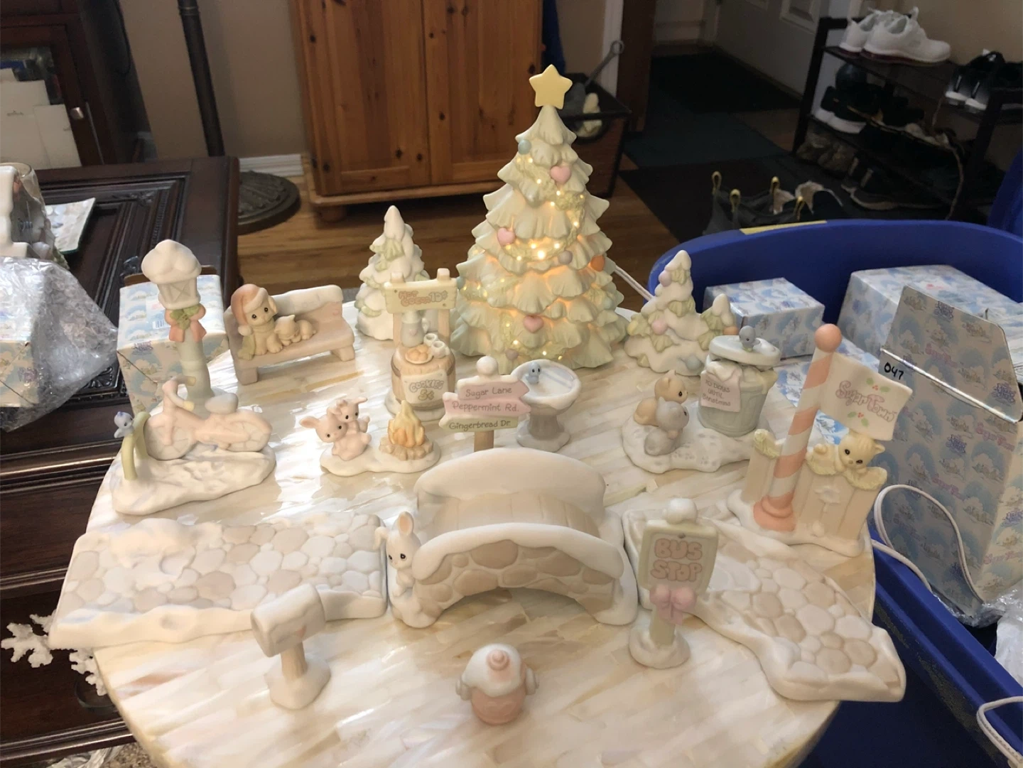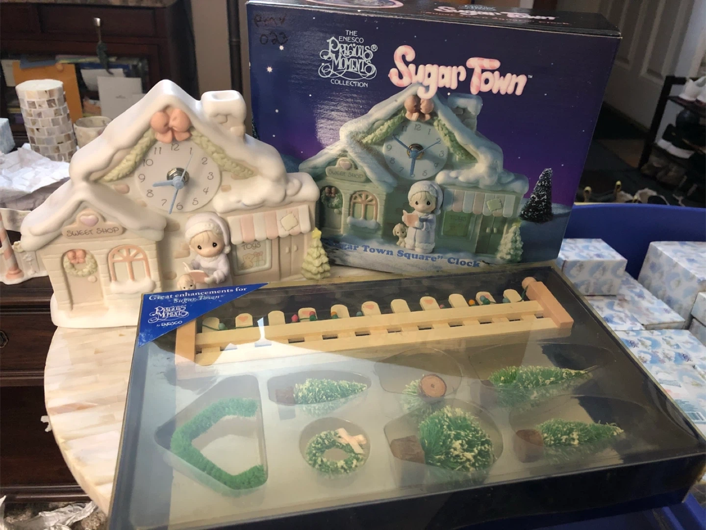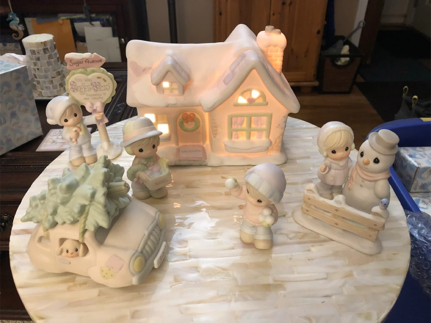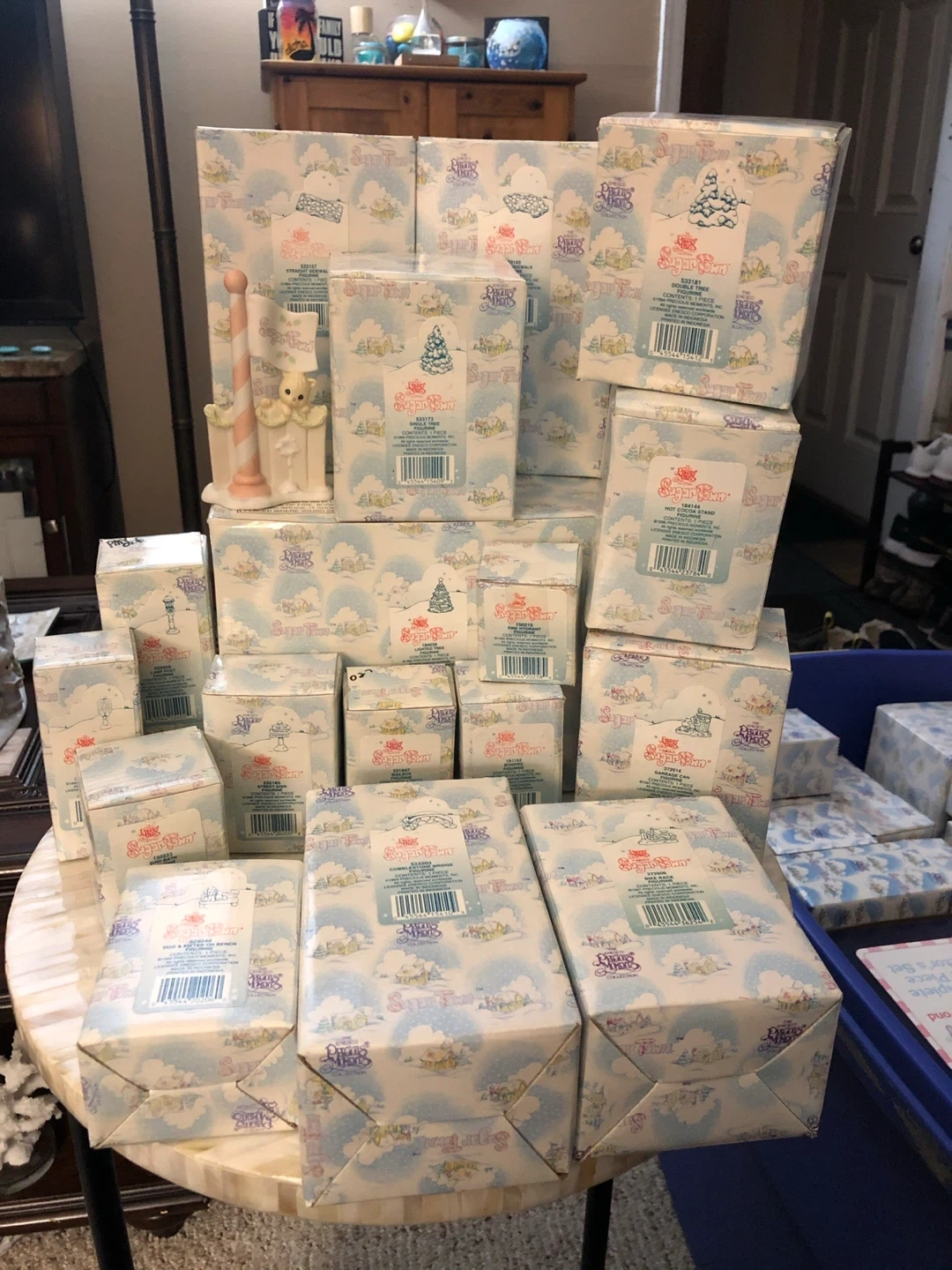 Take a look through the photos. All pieces in original boxes in perfect condition. The boxes have original prices on them. This is a very large complete Christmas Village(Made up of 7 mini villages plus many extra accessory pieces). These are Precious Moments made by Enesco. They are all retired pieces and are from the 1990’s. Each mini village has a large piece that lights up. Each piece was checked and wrapped up and each box is in perfect condition.