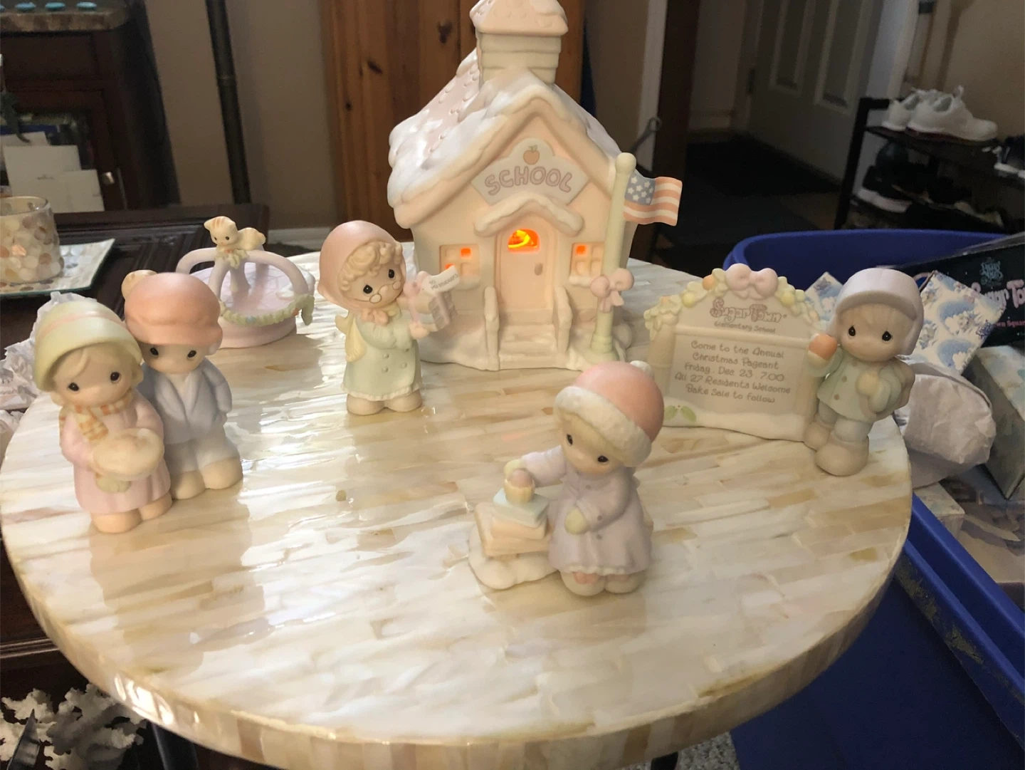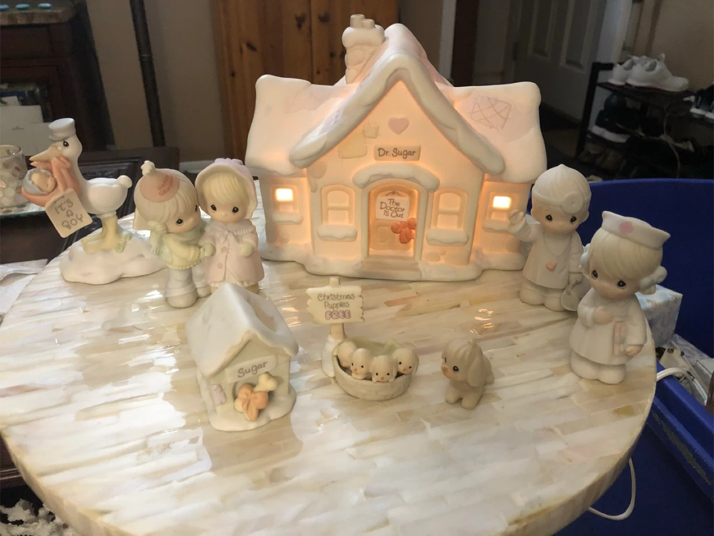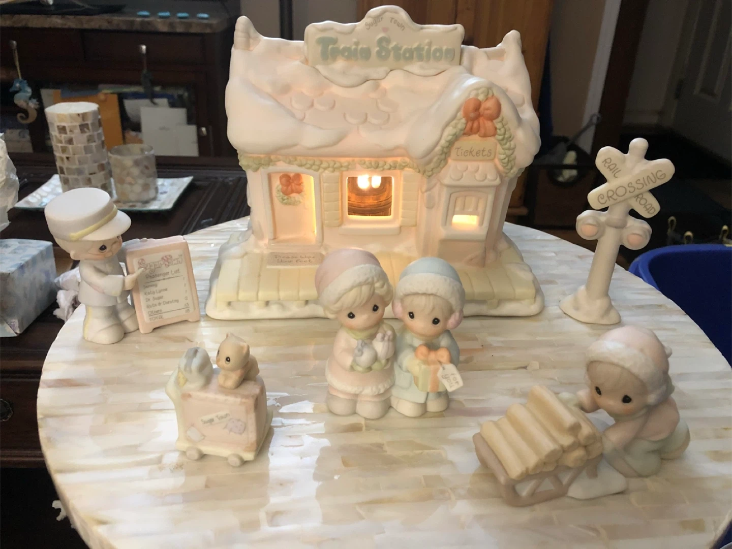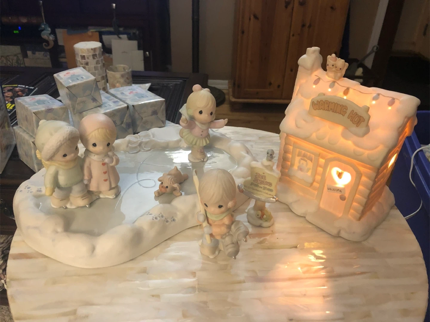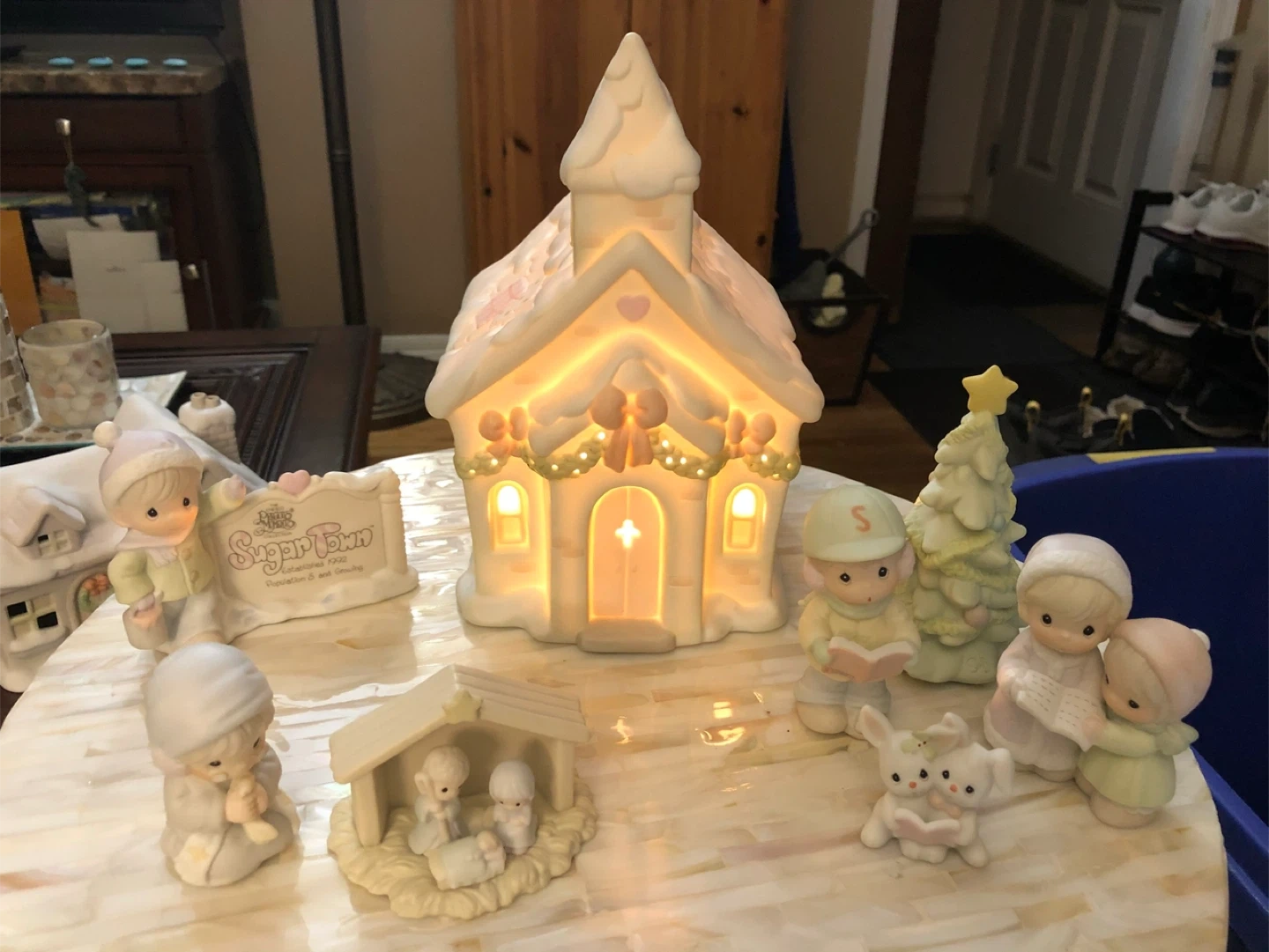 Take a look through the photos. All pieces in original boxes in perfect condition. The boxes have original prices on them. This is a very large complete Christmas Village(Made up of 7 mini villages plus many extra accessory pieces). These are Precious Moments made by Enesco. They are all retired pieces and are from the 1990’s. Each mini village has a large piece that lights up. Each piece was checked and wrapped up and each box is in perfect condition.