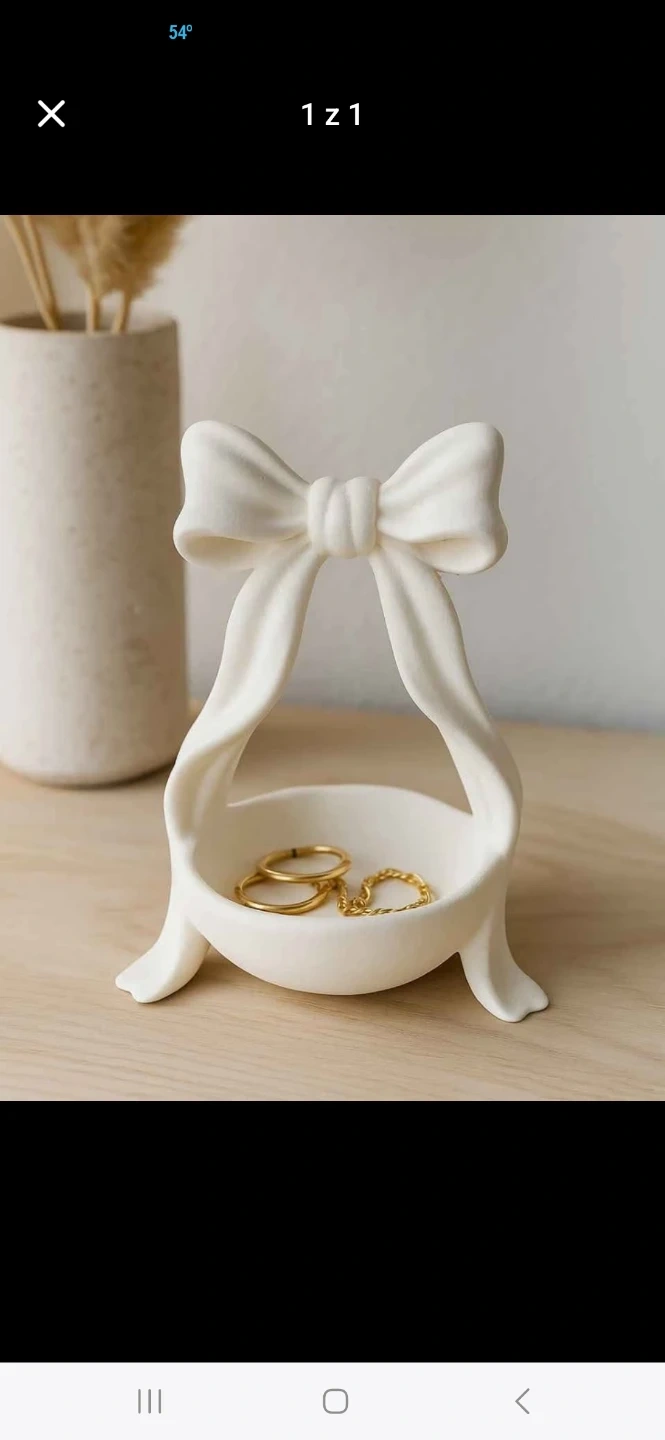 This is a lovely white plastic ring holder shaped like a bow! It's perfect for keeping your rings and small jewelry organized and adds a touch of elegance to any space. It’s in great condition and ready for a new home