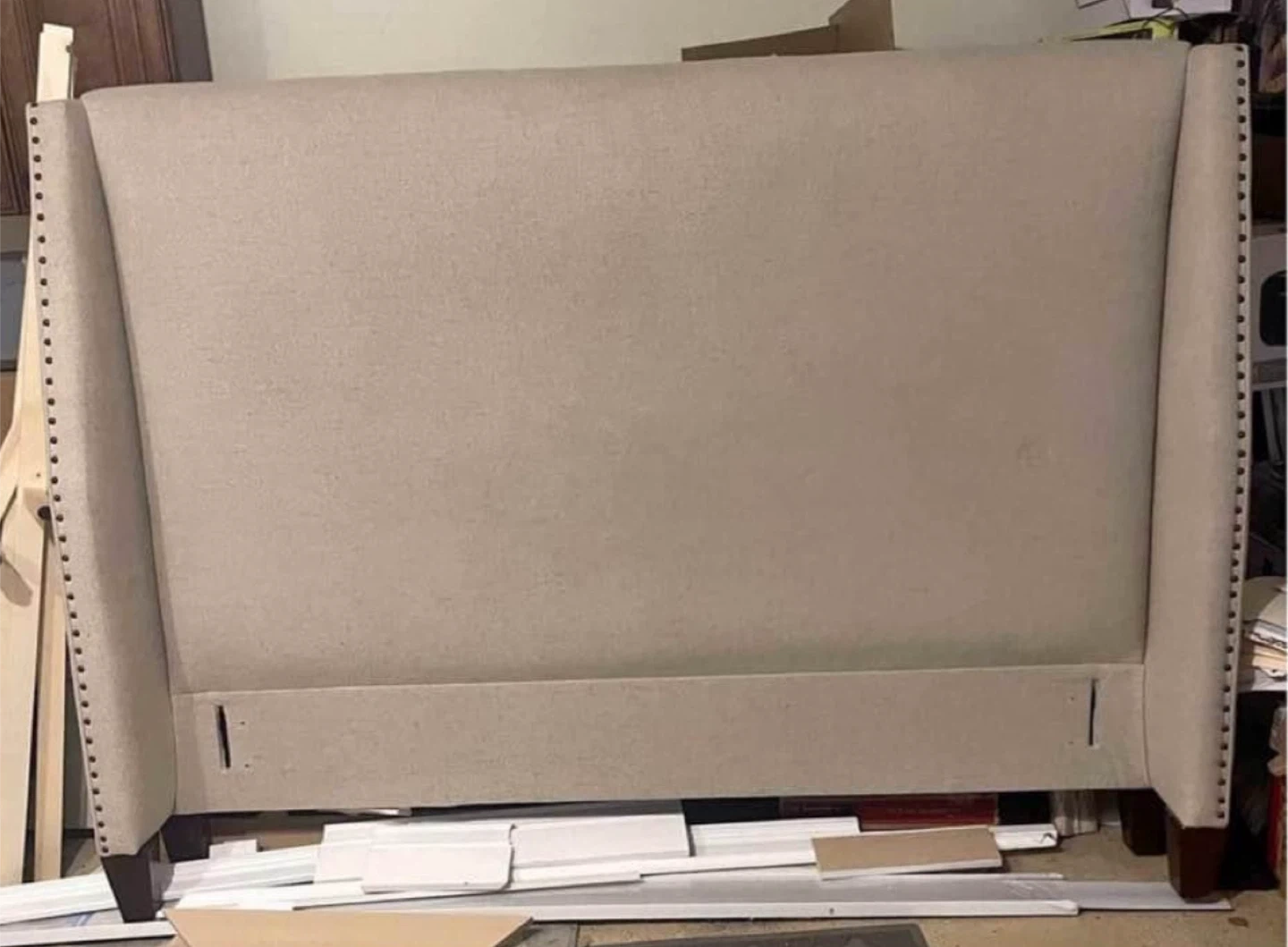 Here's a stylish upholstered nailhead wingback headboard! It's in good condition and ready to add a touch of elegance to your bedroom. Perfect for creating a cozy and sophisticated look!