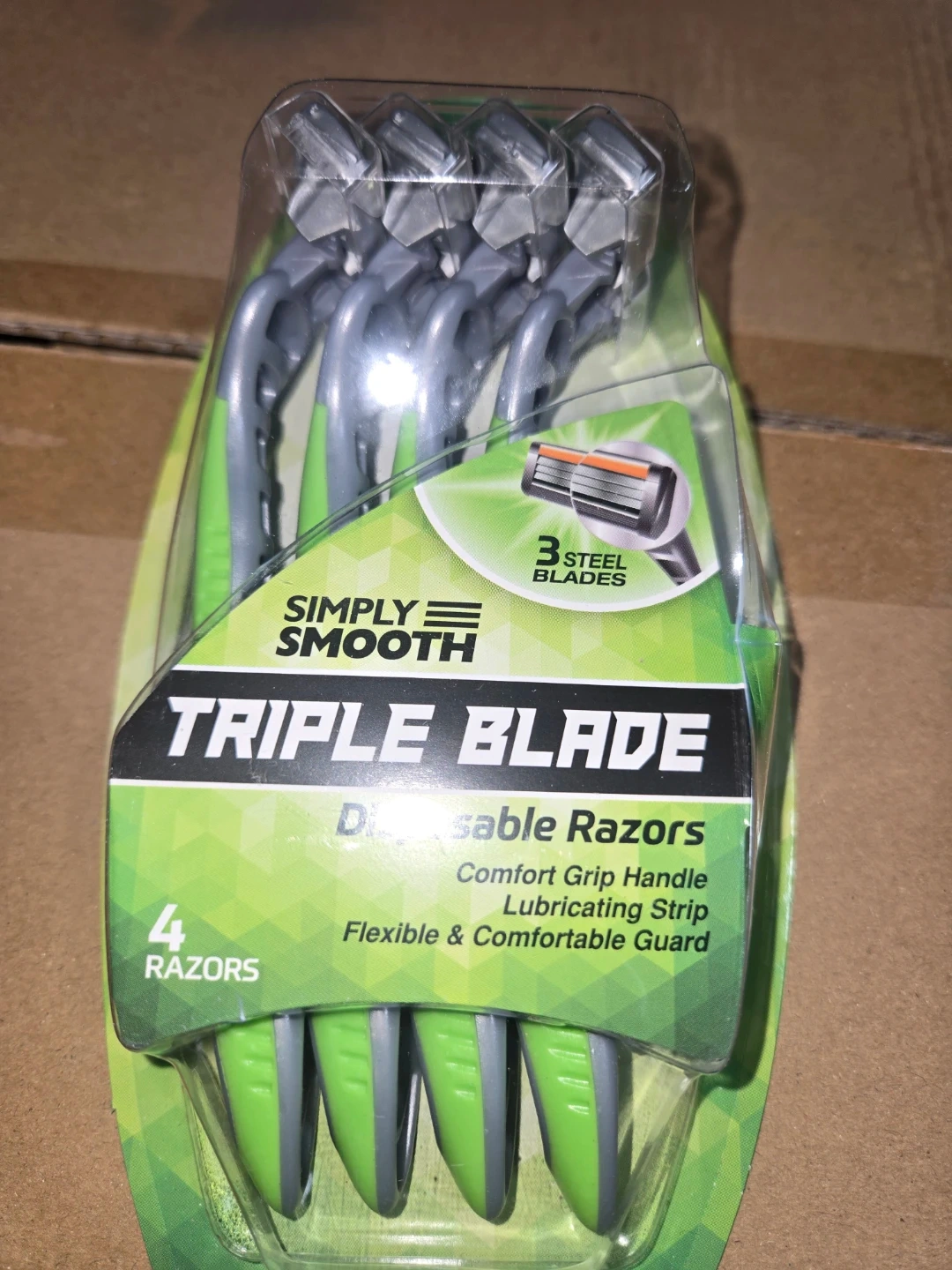 Selling a pack of Simply Smooth Triple Blade disposable razors. It comes with 4 razors, each featuring 3 steel blades. The razors have a comfort grip handle, lubricating strip, and a flexible & comfortable guard
