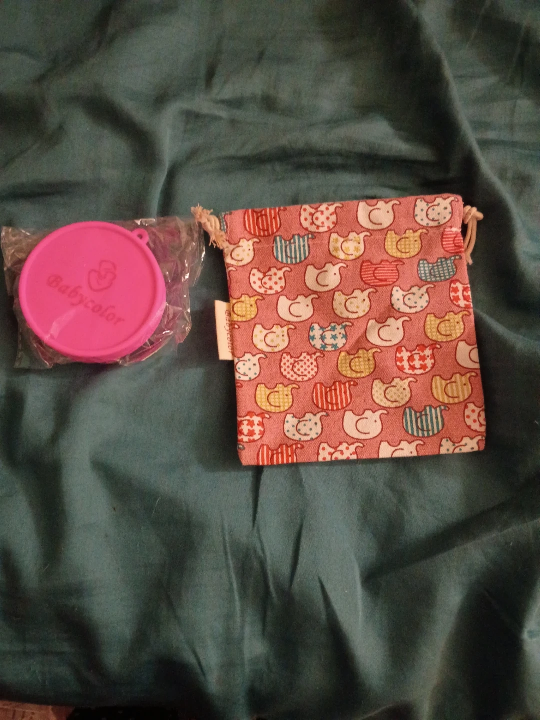I'm selling a Babycolor container and a patterned pouch. The container is a vibrant pink, and the pouch features a cute design with various colored elephants. Both items are in great condition and ready for a new home!