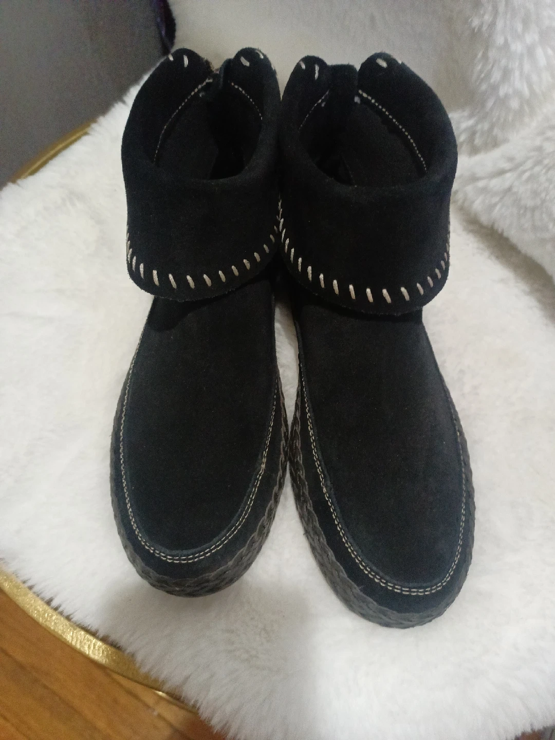Selling a pair of UGG black suede boots. They feature a unique design with stitching detail and a zipper at the back. The soles have the UGG logo. These boots are in great condition and ready for a new home!