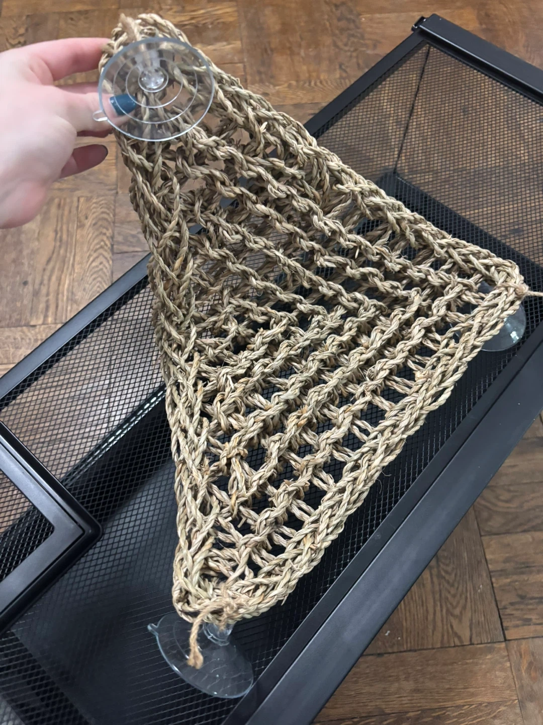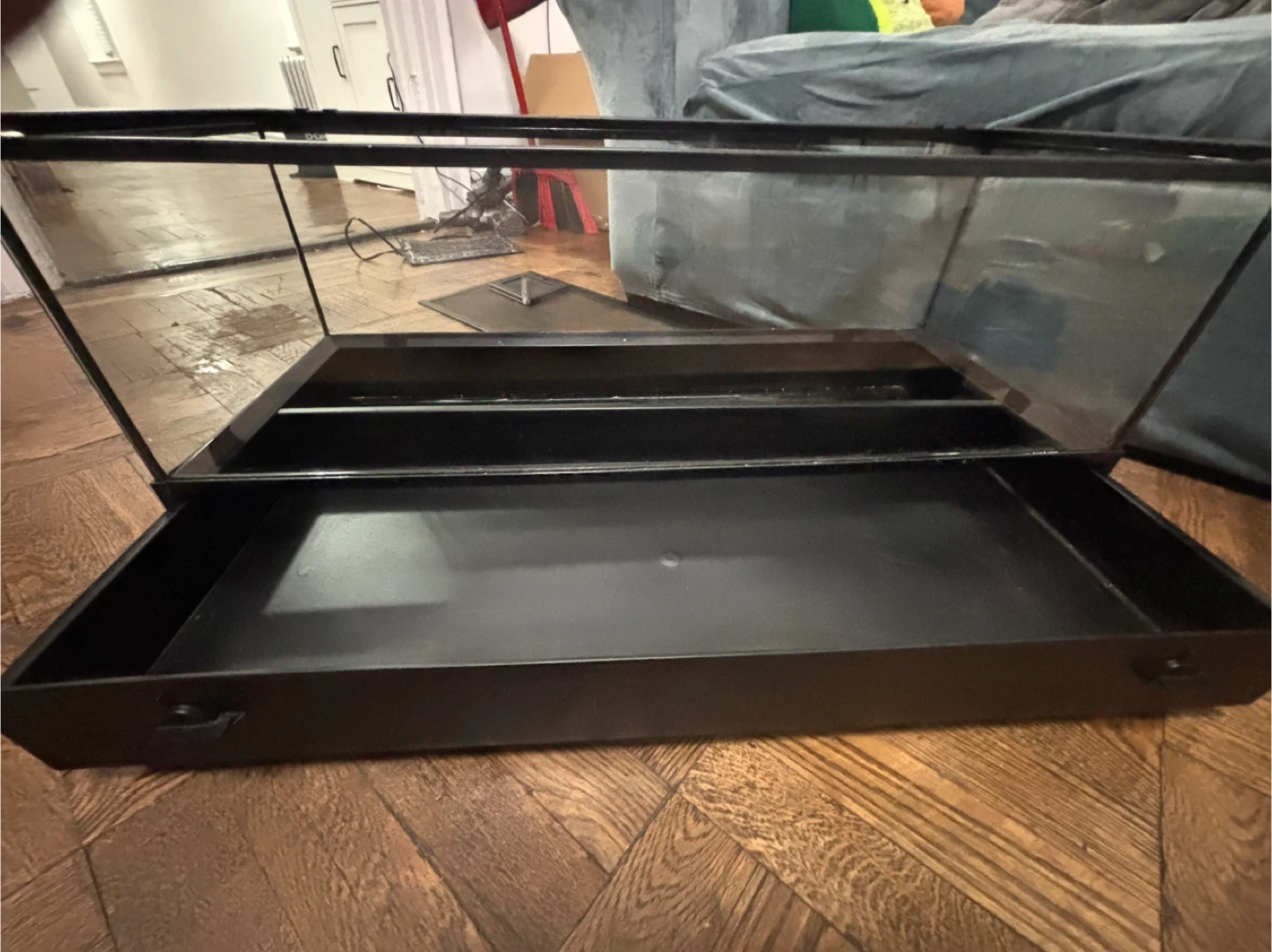 Selling a terrarium enclosure. It's in good condition and ready for a new home for your friend! The enclosure is black and features a mesh top for ventilation and a drawer for easy cleaning. You can use for a hamster, guinea pig, reptile or snake. Also including a small mesh hammock for free.