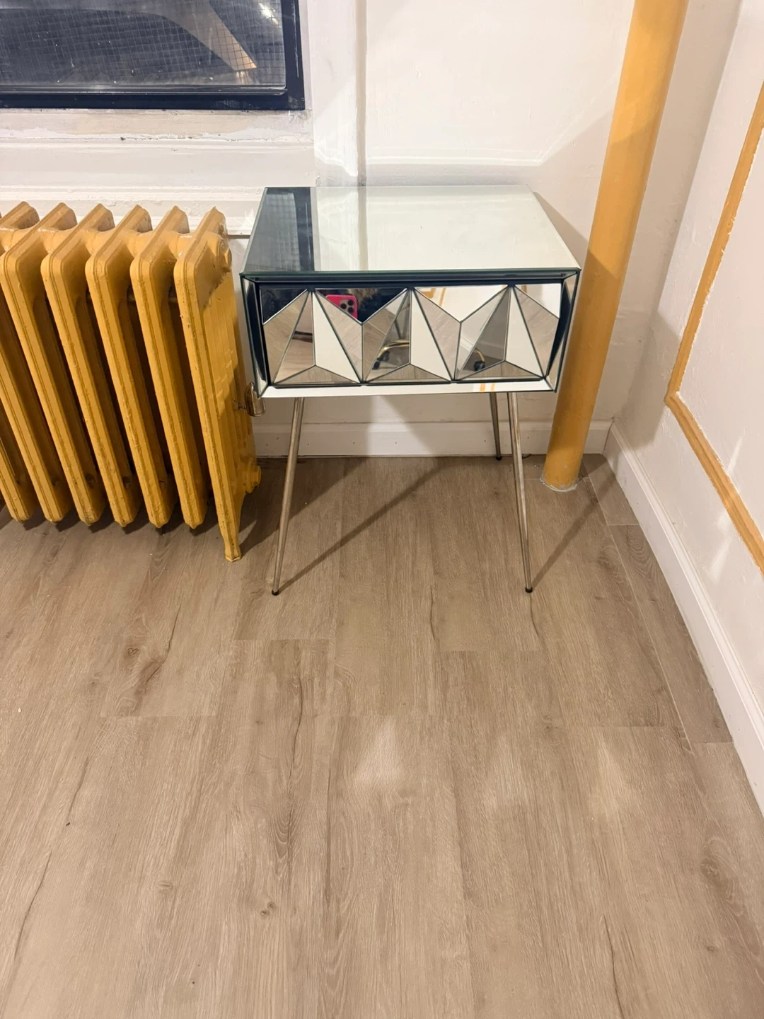 Buy & SellMirrored Accent TableMirrored Accent Table$70Selling a mirrored accent table! It has a unique geometric design on the drawer and sleek metal legs. This table is perfect for adding a touch of glam to any roomConditionLike new0 chats·0 favorites·41 viewsSELLERverifiedDianaWashington Heights1033 reviewsWHERE TO MEETCheck Location