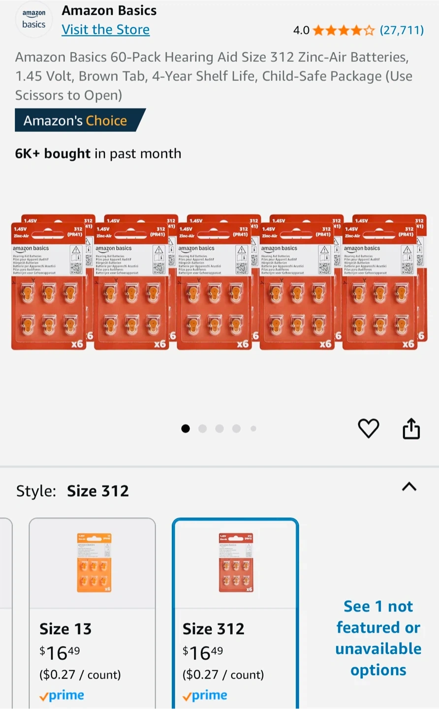 Selling Amazon Basics hearing aid batteries, size 312. They are 1.45V and zinc-air. The packaging indicates a 4-year shelf life. The expiration date is 2028 September 30