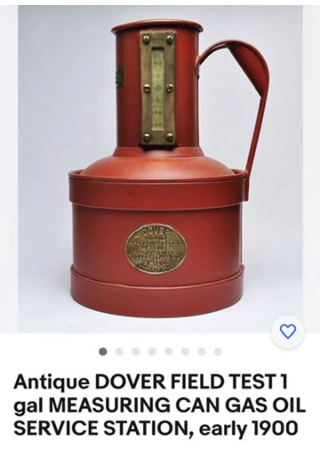 Selling an antique Dover Field Test 1-gallon measuring can. This unique piece is from an early 1900s gas oil service station. It's a great find for collectors or anyone interested in vintage equipment