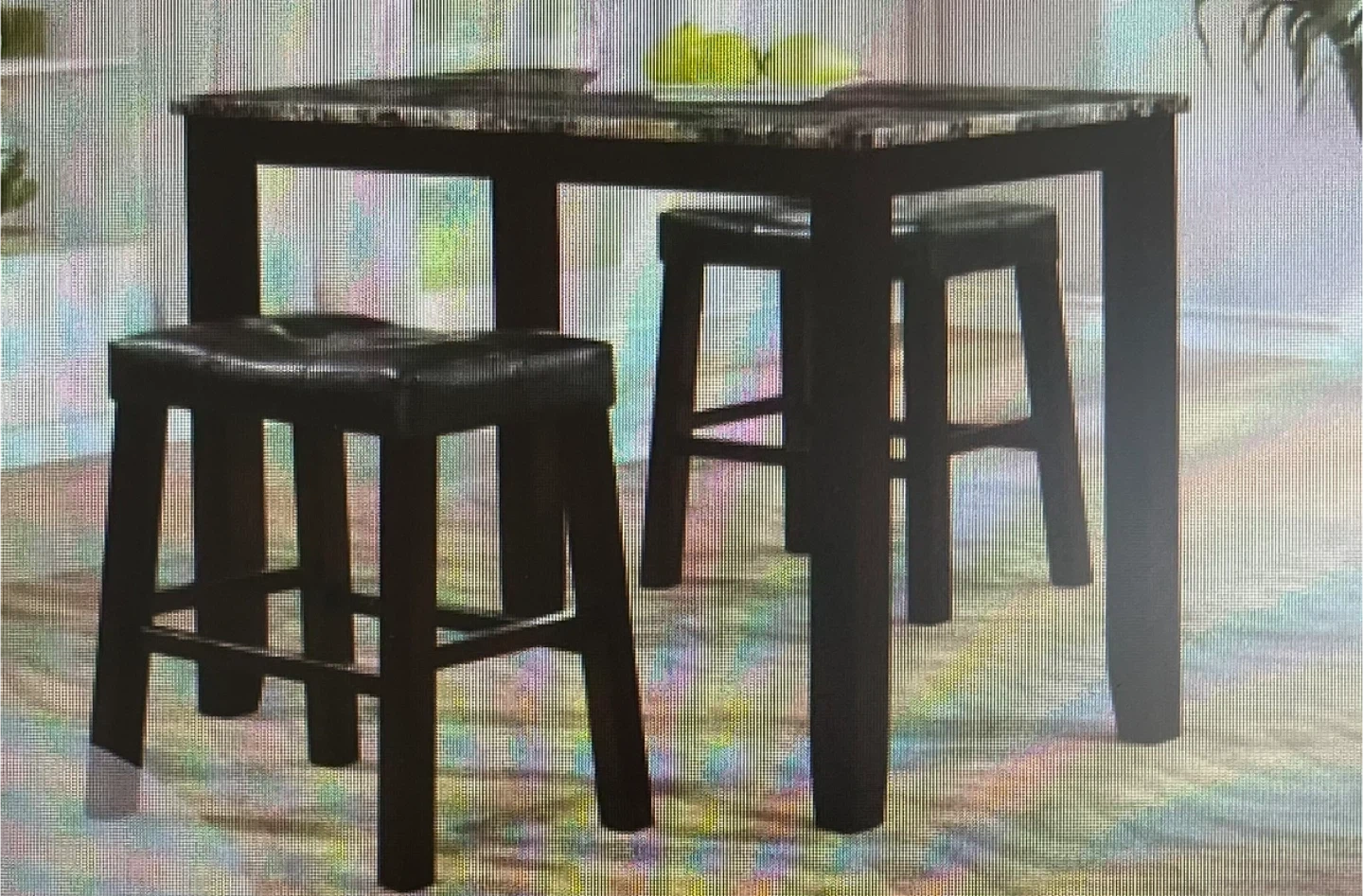 Selling a bar table set that includes the table and two matching stools. The set features a dark brown finish and a faux marble top on the table. The stools have padded seats for extra comfort. Great for a small dining area or kitchen!