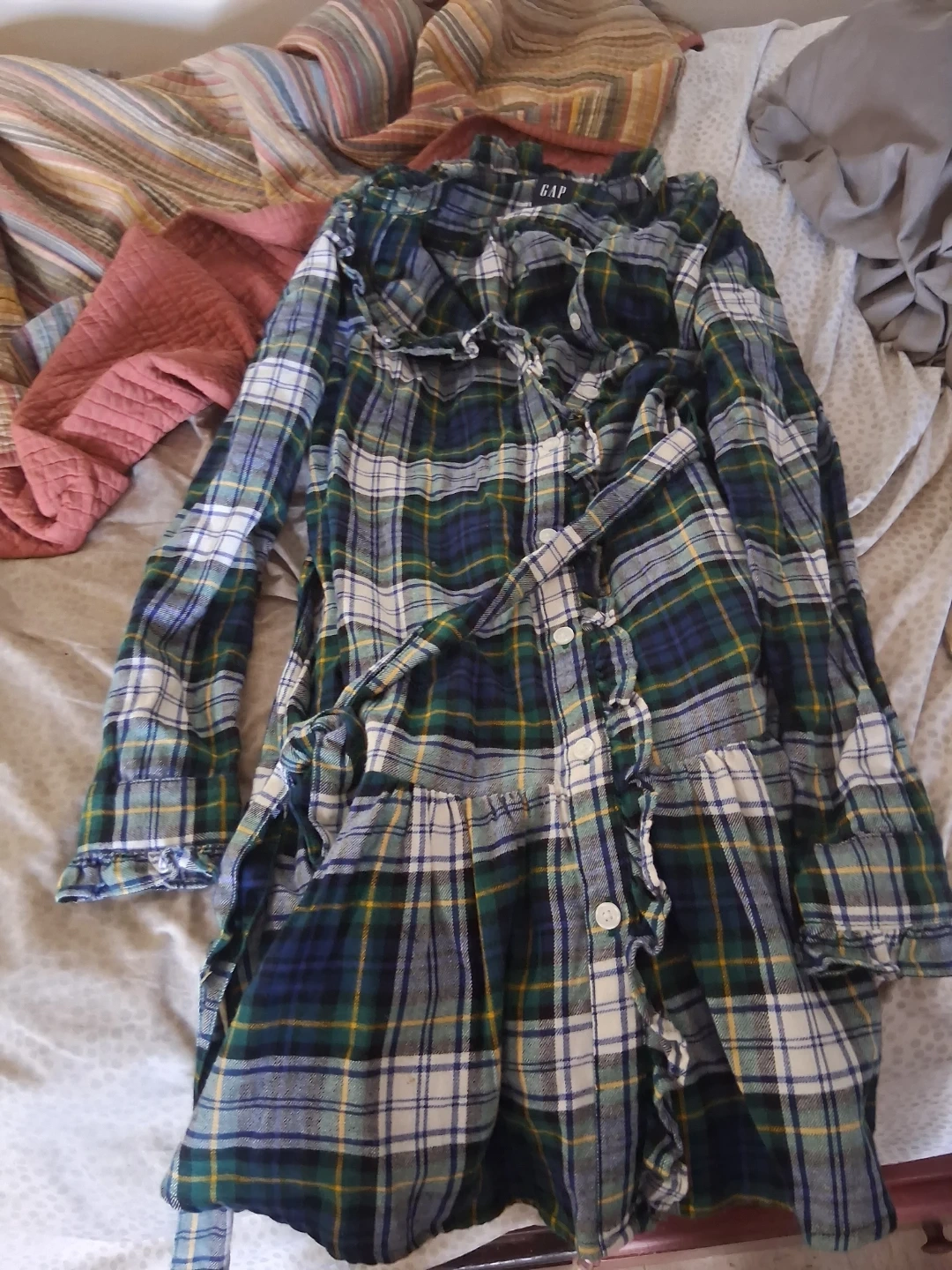 This GAP dress features a classic plaid pattern in shades of green, blue, and white. It has a comfortable flannel material, perfect for casual wear. The dress includes a belted waist and ruffle detailing.