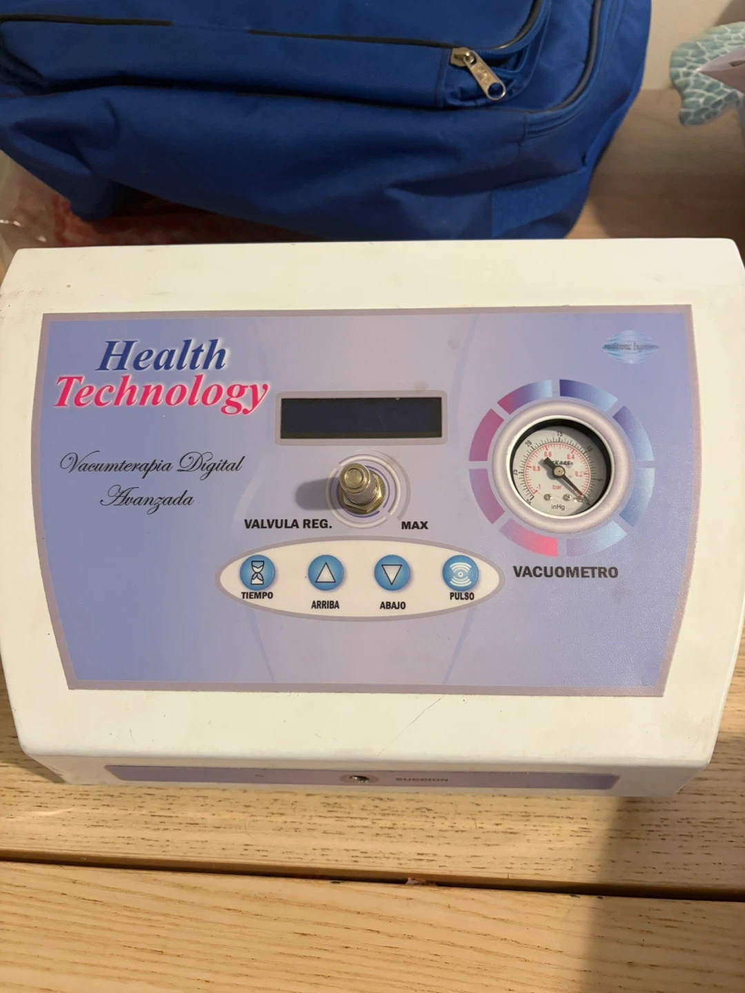 Selling a Health Technology Vacuumterapia Digital Avanzada device. It features a vacuum gauge and various control buttons for adjusting the therapy settings. The device operates at 120V - 60Hz with a maximum power of 18W.