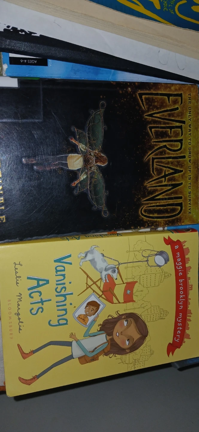 Selling two books: Everland and Vanishing Acts. Everland is a book where the only way to grow up is to survive. Vanishing Acts is a Maggie Brooklyn Mystery book by Leslie Margolis