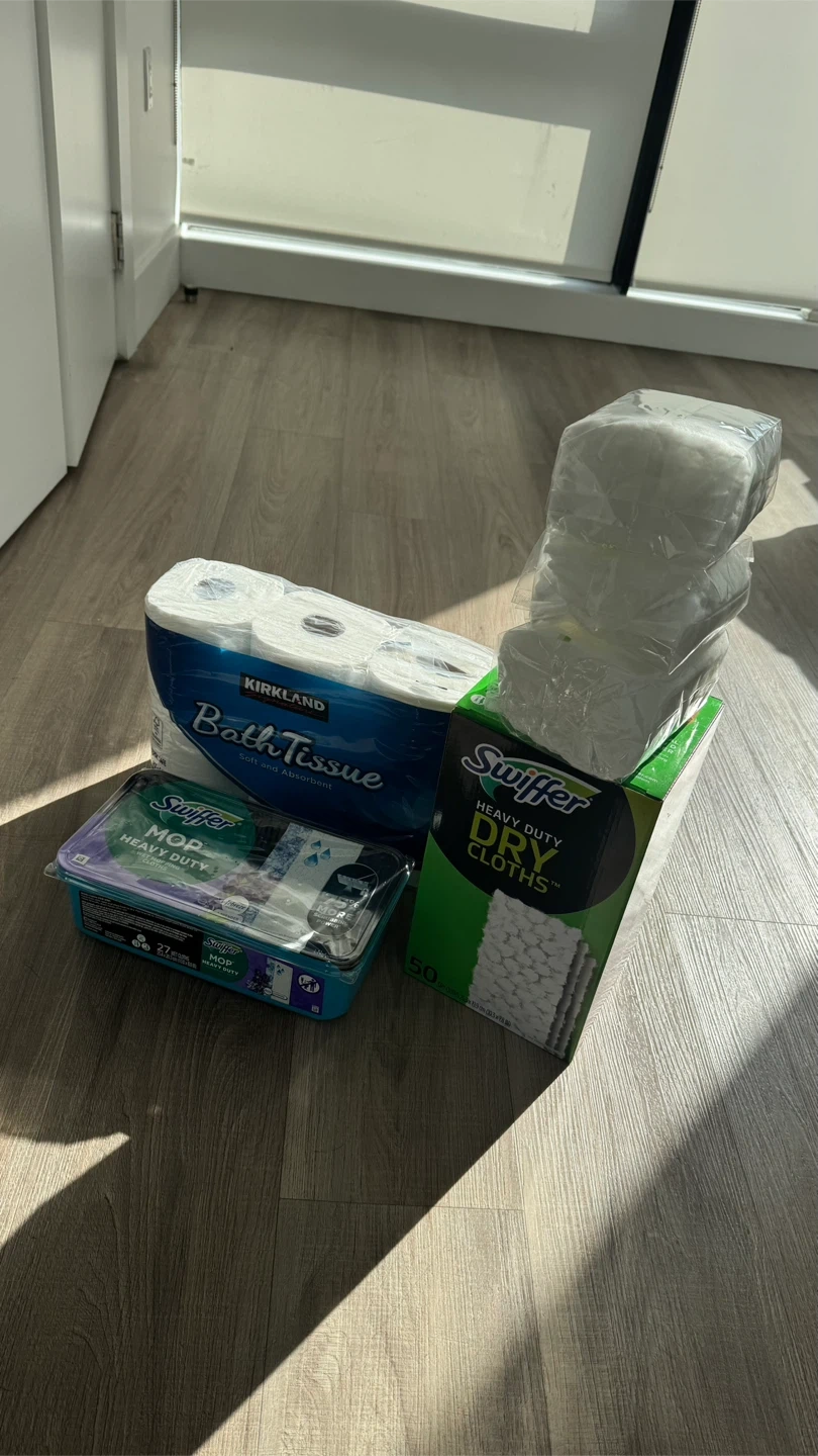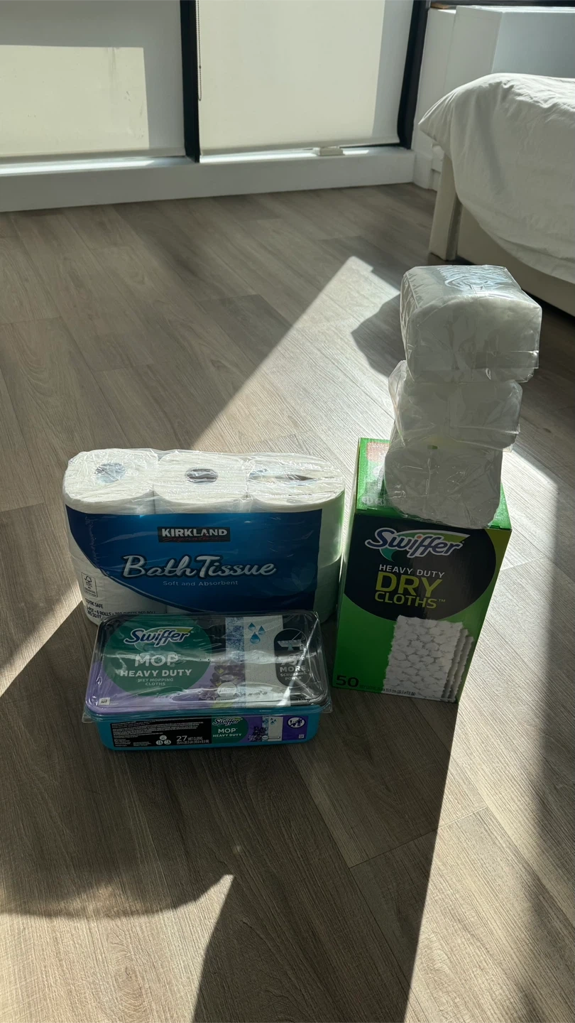 Selling Kirkland Bath Tissue and Swiffer cleaning supplies together! Includes Kirkland Bath Tissue, Swiffer Heavy Duty Dry Cloths (50 count), and Swiffer Mop Heavy Duty Refills (27 count)