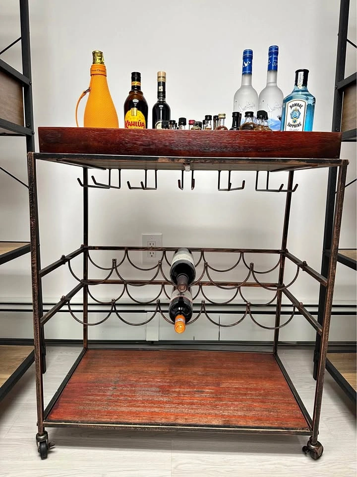 Stained wood and antiqued metal rolling bar cart. Tray topper removes or flips to be a tabletop vs inset tray. Holds up to 16 glasses and up to 10 bottles of wine. Retail price online is $160, this finish is no longer available across retailers. Dimensions provided in photo.