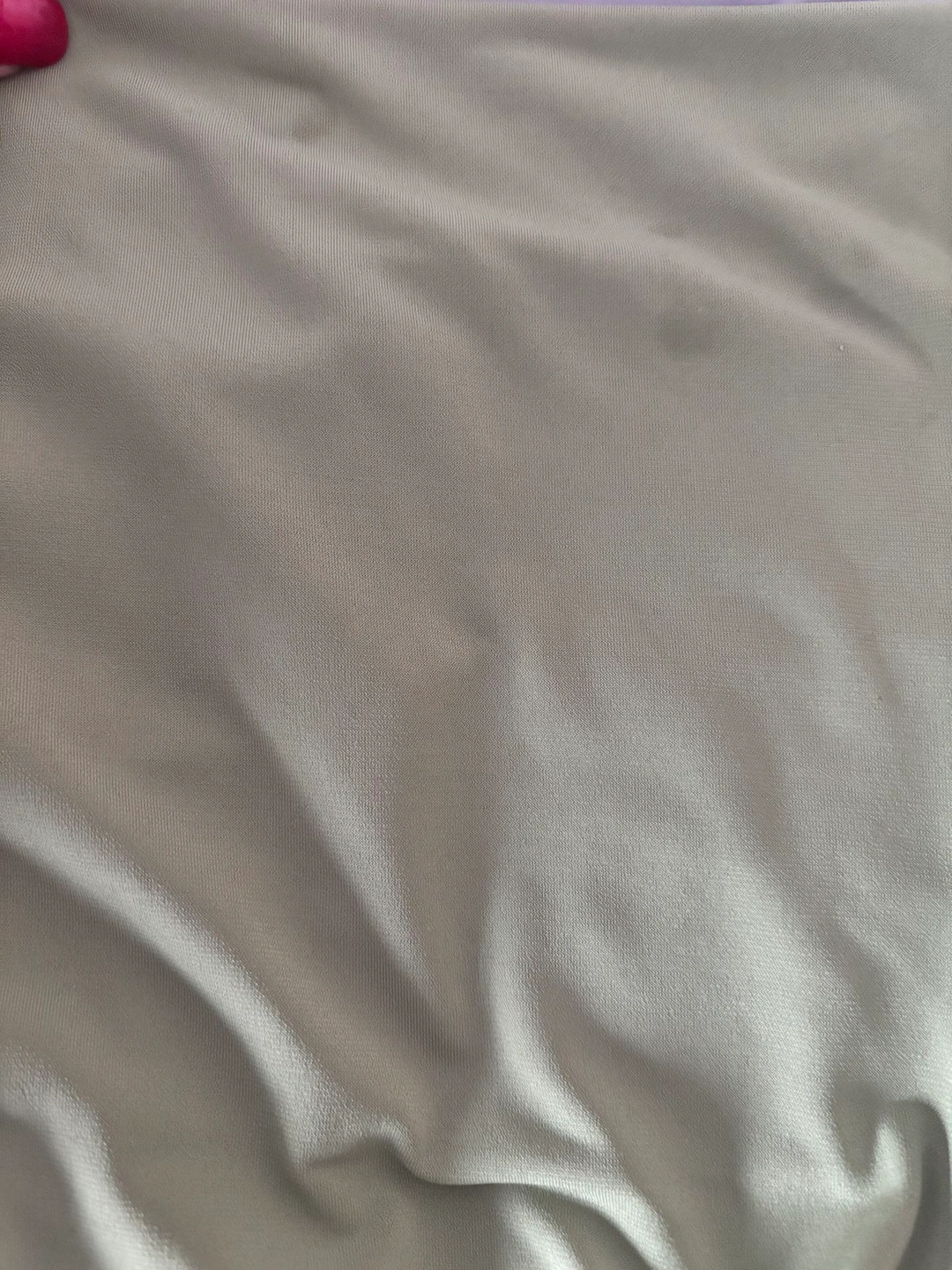 There are a couple of very tiny spots on the front of the dress, but they are barely noticeable and completely hidden when worn because they fall under the draped flap/ruched area. You truly do not see them while wearing the dress.