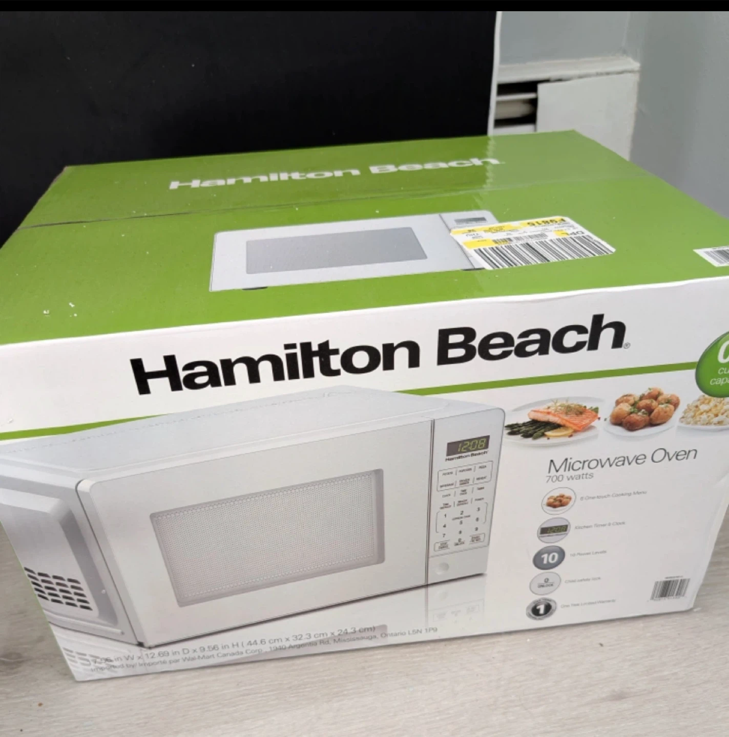 Selling a Hamilton Beach microwave oven. It's a 700-watt microwave oven with one-touch cooking menu. The dimensions are approximately 44.6 cm x 32.3 cm x 24.3 cm. It has 10 power levels and a kitchen timer and clock