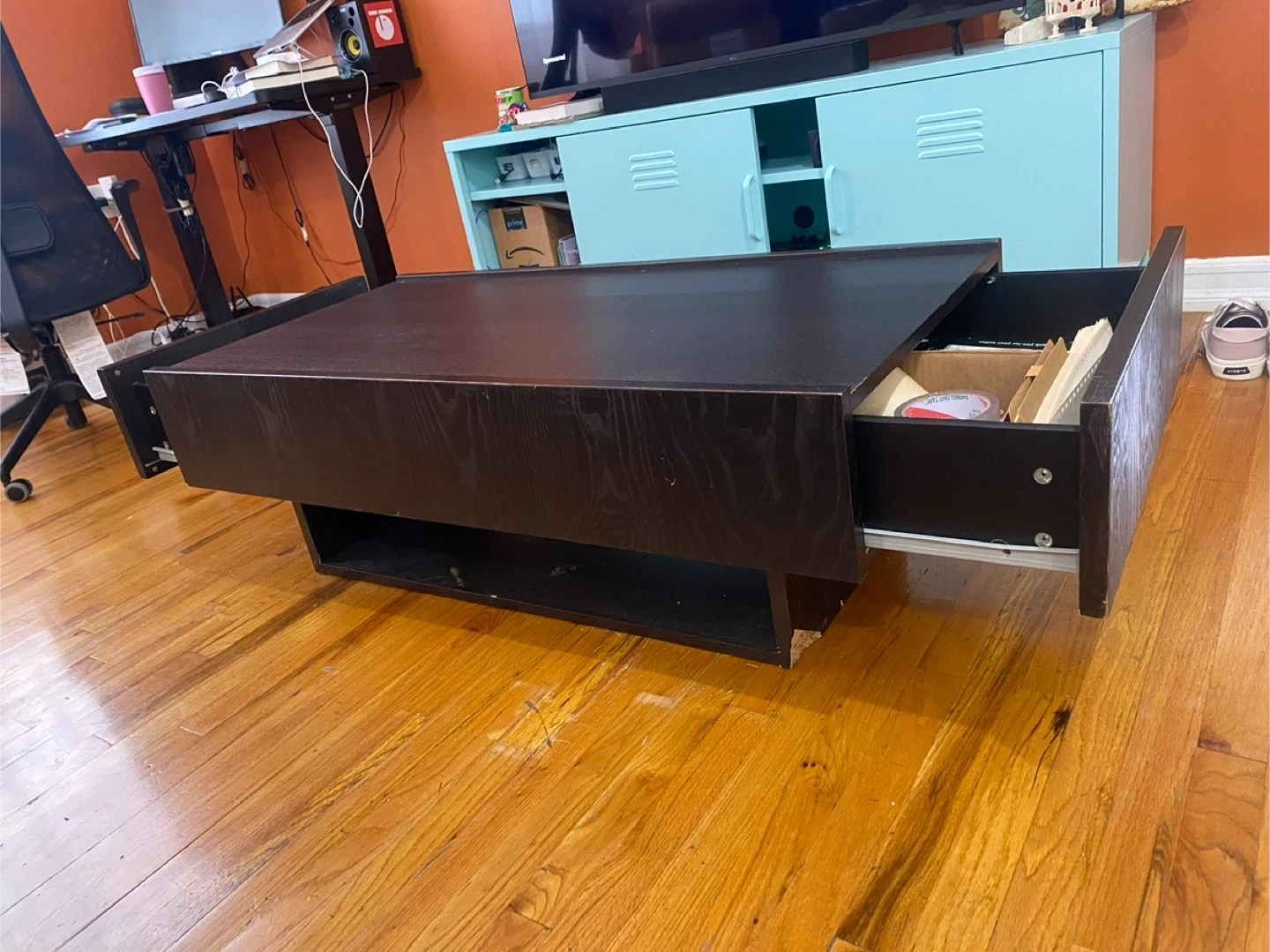 Selling a dark brown coffee table. It features a glass top and a convenient drawer for storage. It's in good condition and ready for a new home! It has a small flaw on the base where the finish peeled off a bit, but it works perfectly.