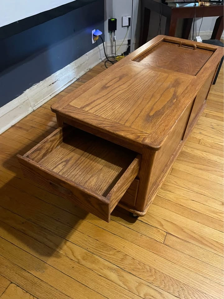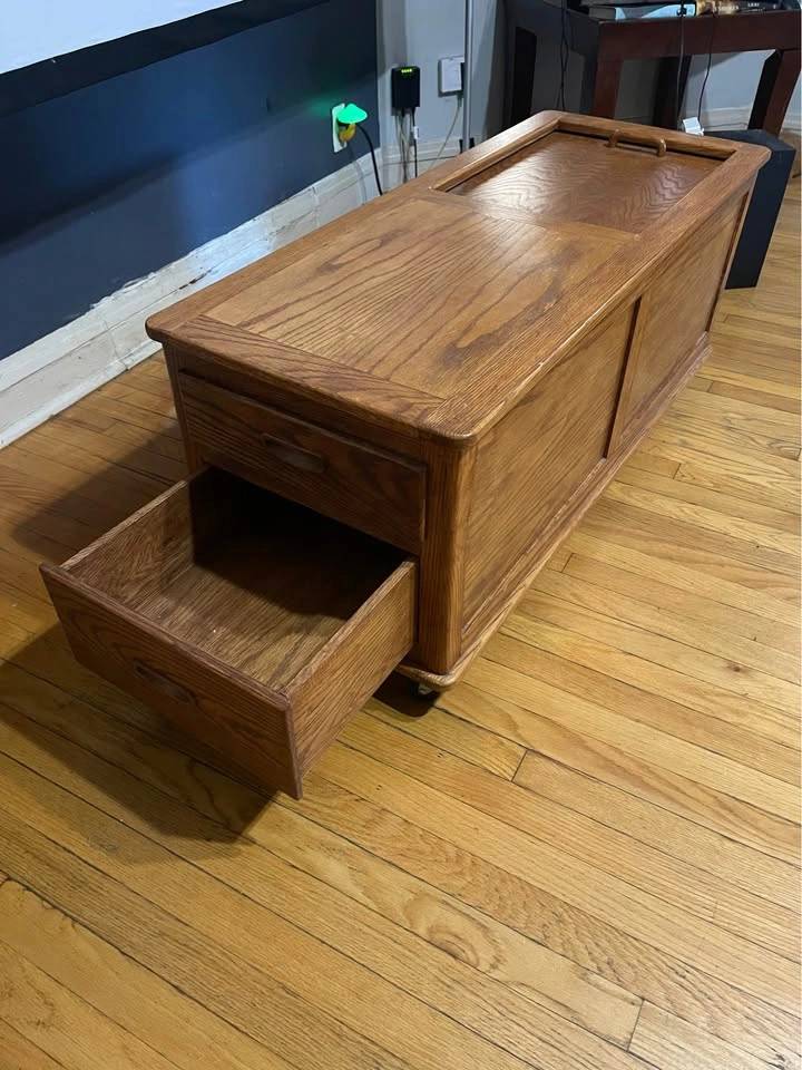 Vintage Solid Wood Rolling Storage trunk with side drawers.