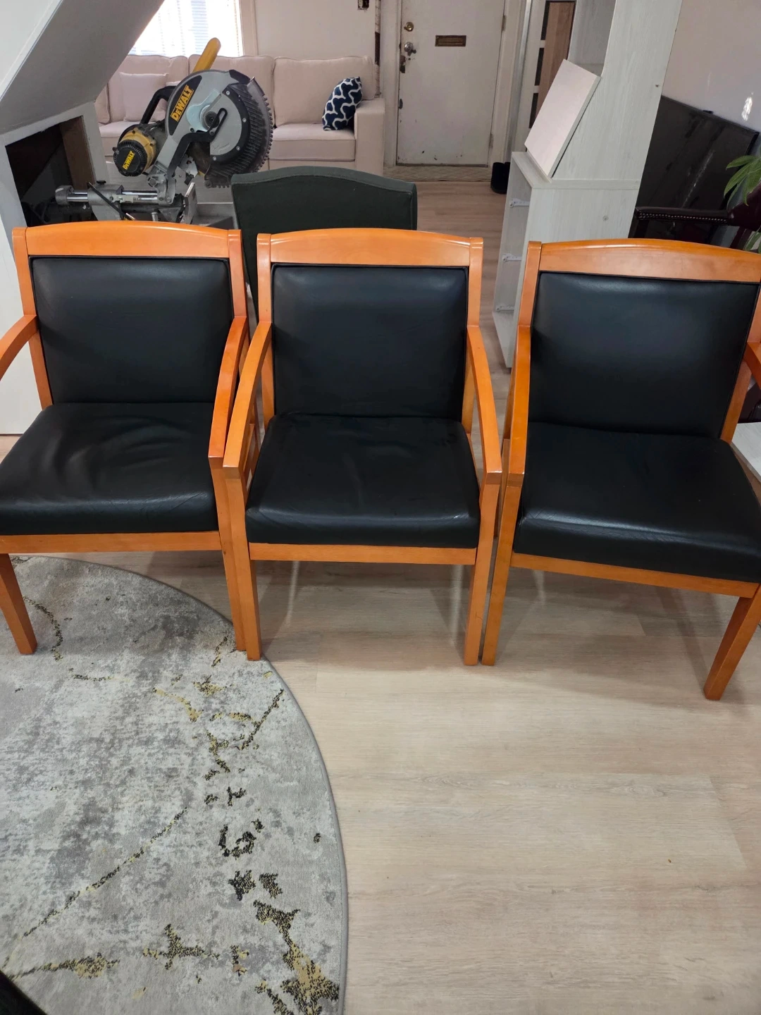 Selling a set of three office chairs. They feature a black leather seat and back with a wooden frame. Great for an office or waiting room!