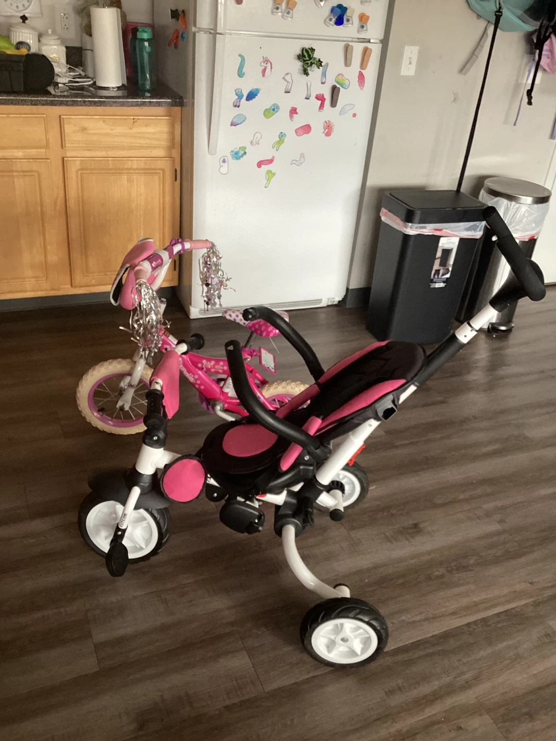 Selling a pink kids bike and a stroller tricycle. Both are in good condition and ready for a new home! Perfect for little ones learning to ride or needing a comfy stroller alternative