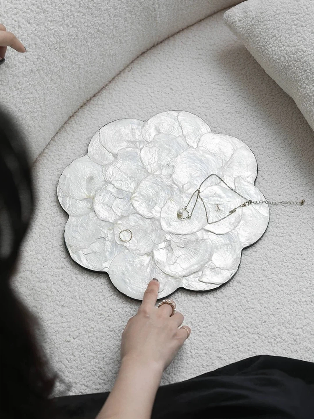 This is a beautiful decorative tray made of mother of pearl. It's perfect for adding a touch of elegance to your home decor. It can be used as a jewelry tray, a catch-all for keys, or as a decorative piece on its own